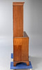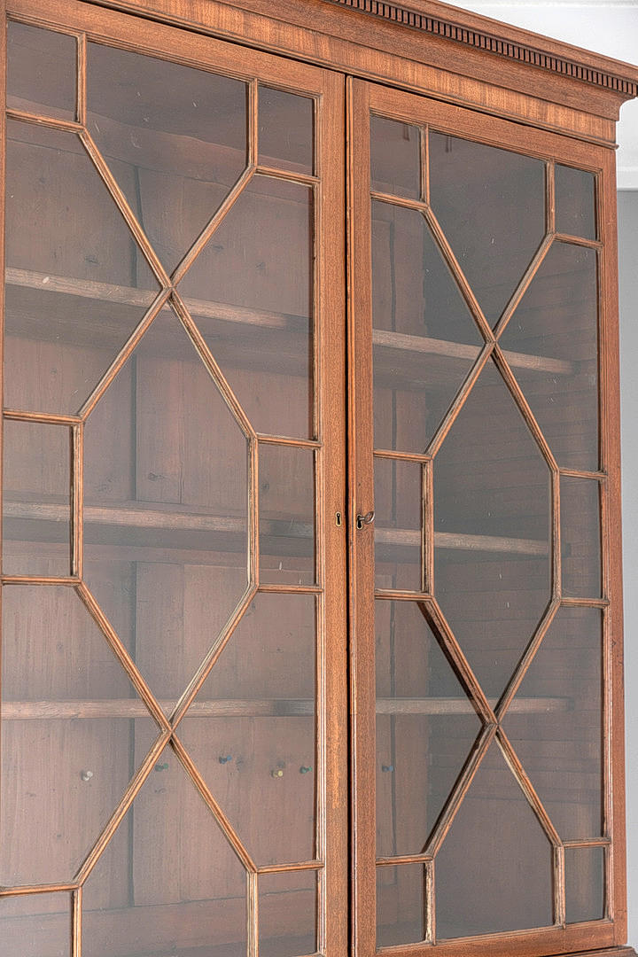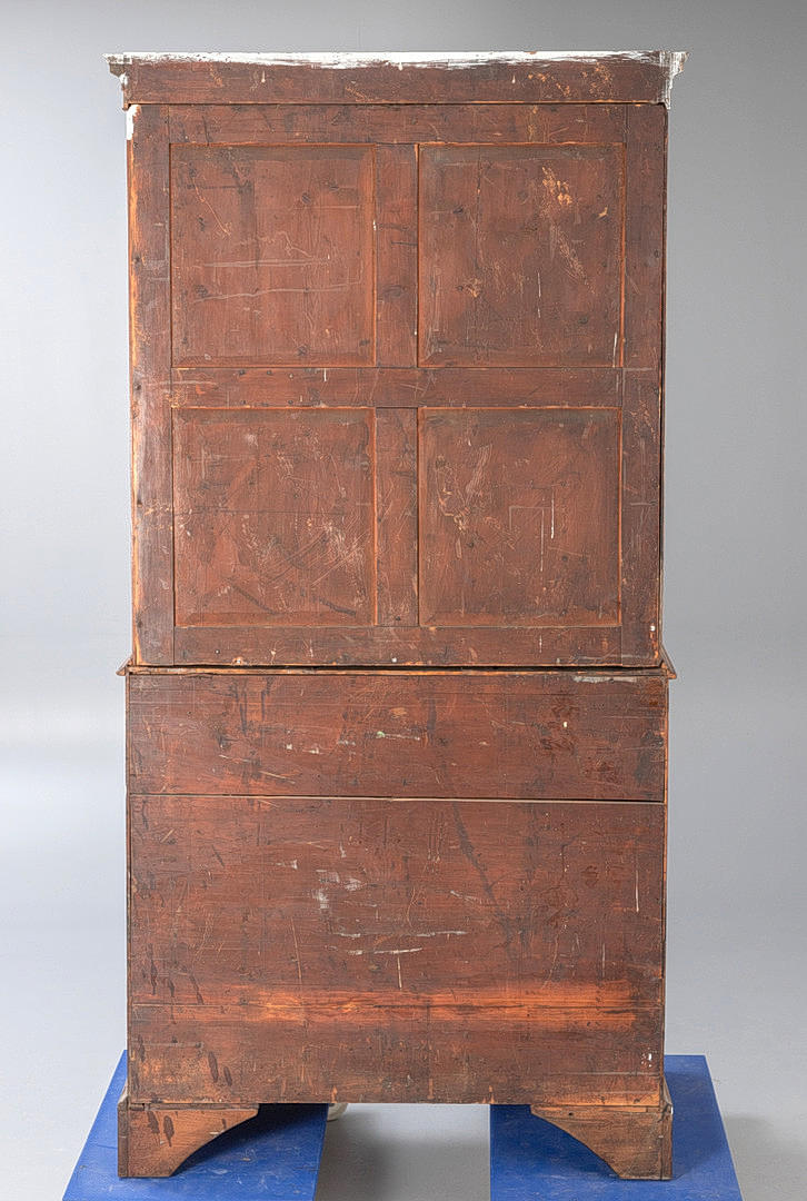 Gegliederte Inneneinrichtung und grüne Ledereinlage auf der Schreifläche. Aufsatz mit zwei verglasten Türen hinter wabenförmigen Streben. Umlaufender Zahnkranz im Giebel. Innen drei Einlegeböden: HxBxT: ca. 228 x 152 x 57 cm.
