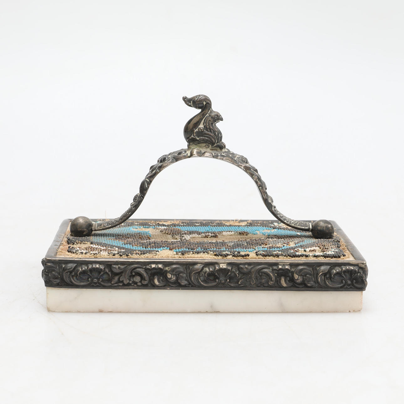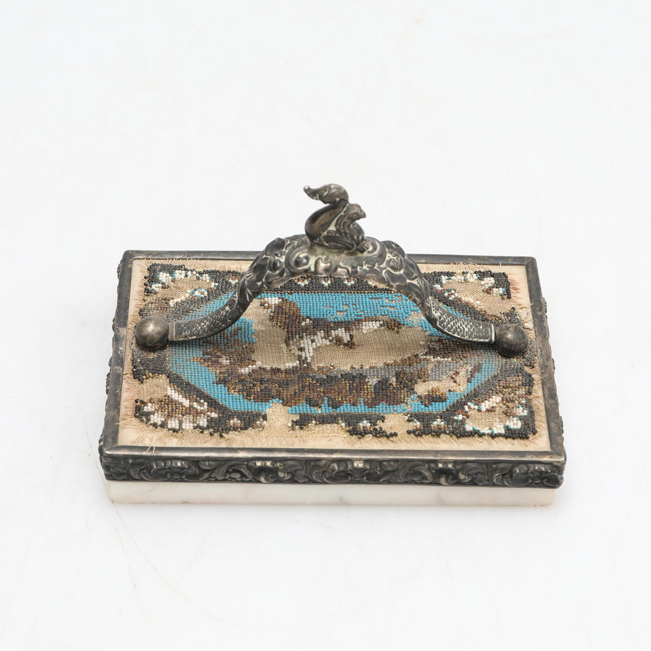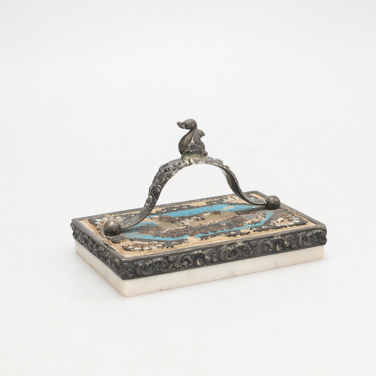 BRIEFBESCHWERER, Marmor, Silber und Stickerei.