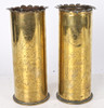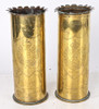 Grabenkunst aus dem Ersten Weltkrieg, Vasen in Form von zwei deutschen 77-mm-Granatengehäusen, die Ränder spitz geschnitten und aufgeweitet, beide mit dem Emblem der königlichen Ingenieure in einem Schild eingraviert und „Frieden, 28. Juni 1919", was sich auf das Datum bezieht, an dem der Vertrag von Versailles unterzeichnet wurde, der den Ersten Weltkrieg offiziell beendete, Höhe 22 cm, (2).
