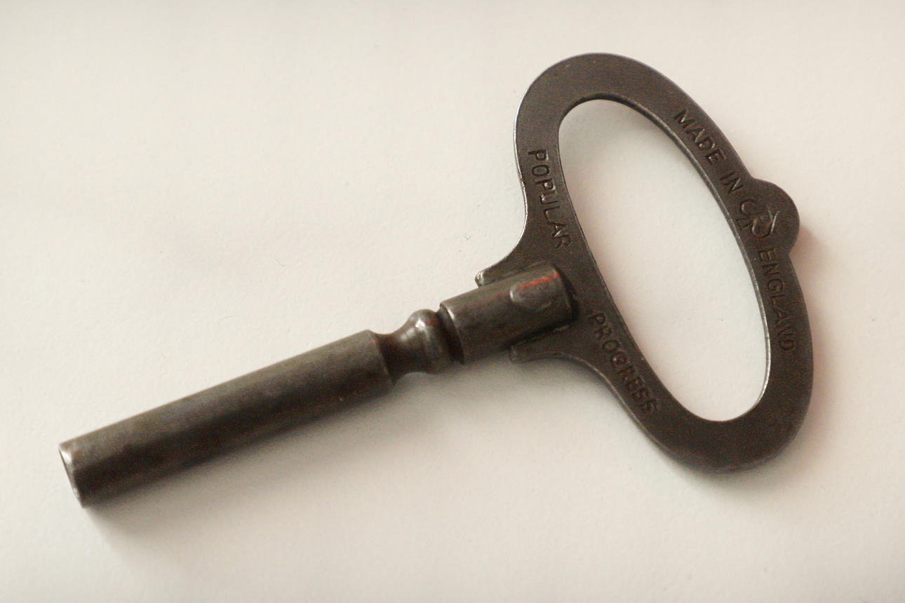 Mit einem weißen emaillierten, 30 cm großen Zifferblatt und schwarzen Ziffern, einem Eichengehäuse und einem verschmolzenen Uhrwerk. Mit dem Schlüssel, insgesamt 36 cm breit.