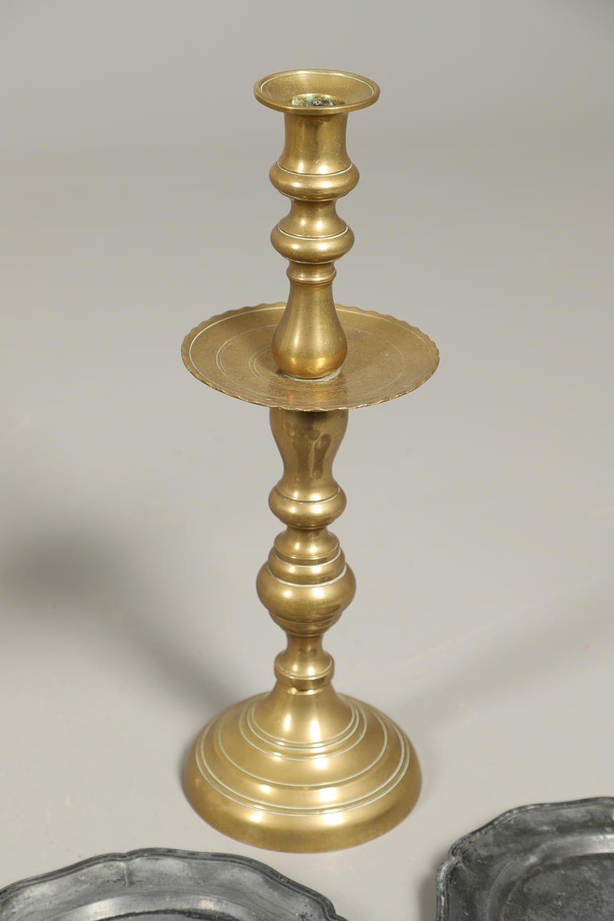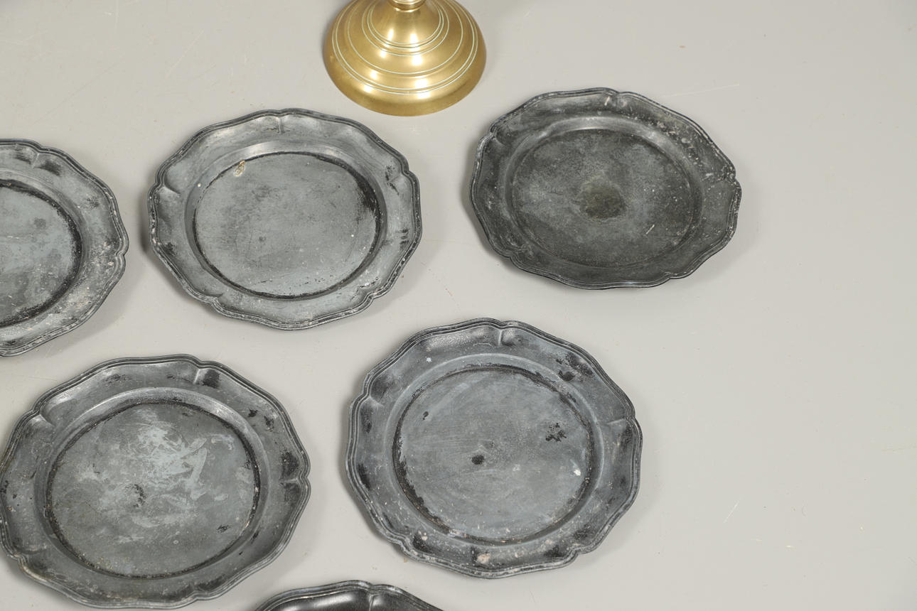 an mehrknopfigen Stielen mit breiten Auffangschalen, 43 cm hoch; zusammen mit einem Satz von zehn Zinntellern mit geformtem Rand, 22 cm Durchmesser.
