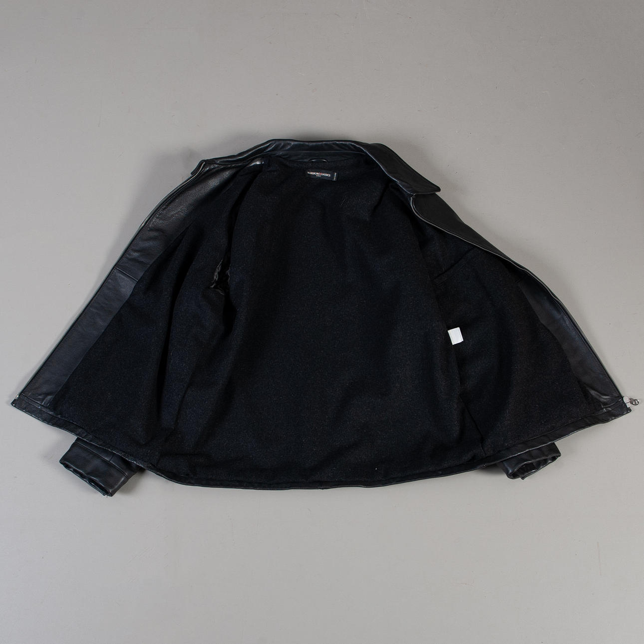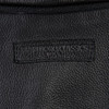 Schwarzes Leder mit Reißverschluss, zwei Seitentaschen, eine Innentasche. Gefüttert mit Wollmischgewebe.