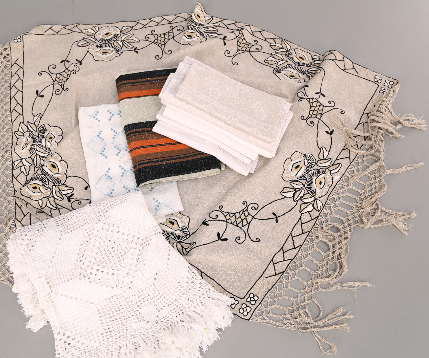 323594. TISCHDECKEN 10 Stück, Leinendamast, Baumwolle, gehäkelt, bestickt.