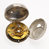 Spindeluhr, emailliertes Zifferblatt mit römischen Ziffern. Th. Whitt, London. Gebräuntes Flüstern. Silbernes Kästchen „Löwe“ und Buchstabe „U“ zur Datierung. Staubkapsel aus Metall. Sehr schönes Zifferblatt. Im Lieferumfang ist eine große Schutzkapsel für die Uhr aus Metall enthalten, in die unten Papierscheiben mit aufgedruckter Werbung für Uhrmacher eingelegt sind. Eine CD mit: „Cordley Norton, Red Lion Street, London“. Ein Zifferblatt: „A. Kessel, Uhrmager, Nestved“.