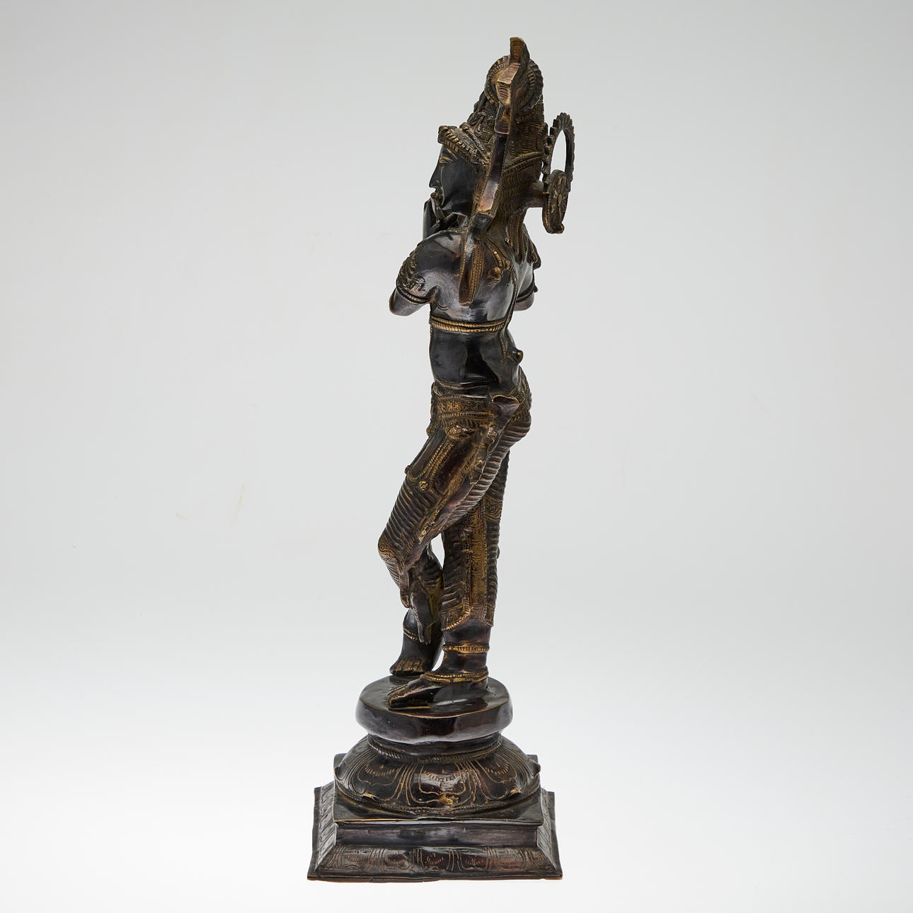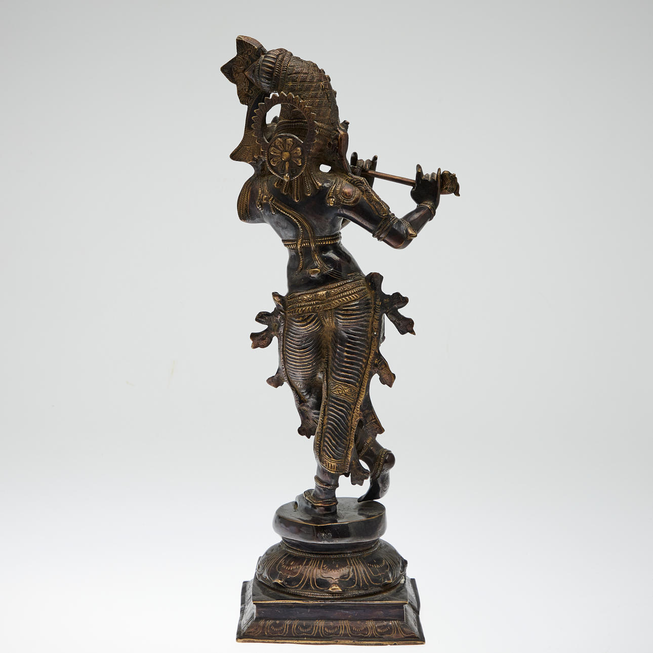 Skulptur / Figur, Krishna, Messing bronziert. Figur aus dunkel bronziertem Messing in Form der hinduistischen Gottheit Krishna mit Flöte, auf einem Sockel platziert, H.61cm, B.22cm, T.19cm.