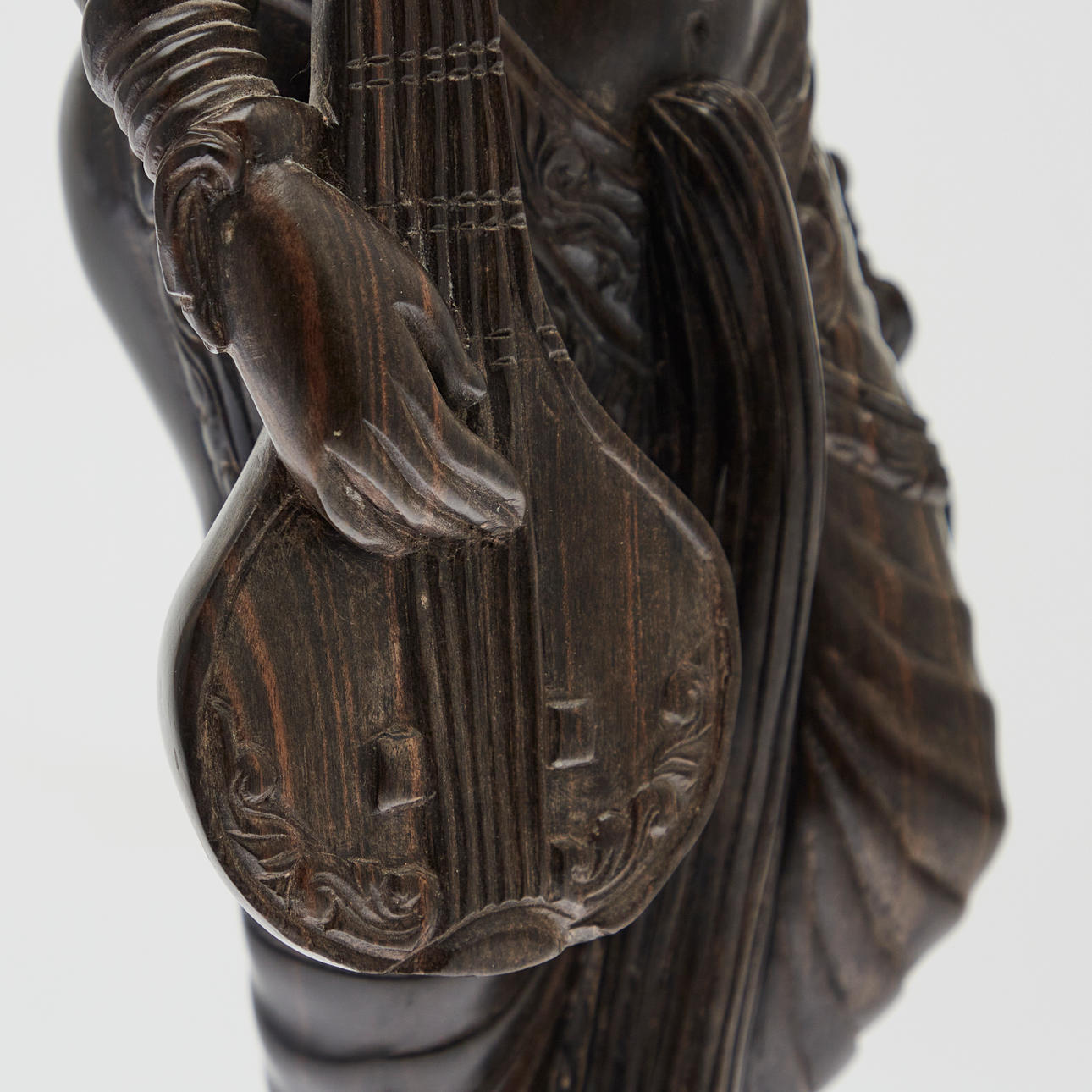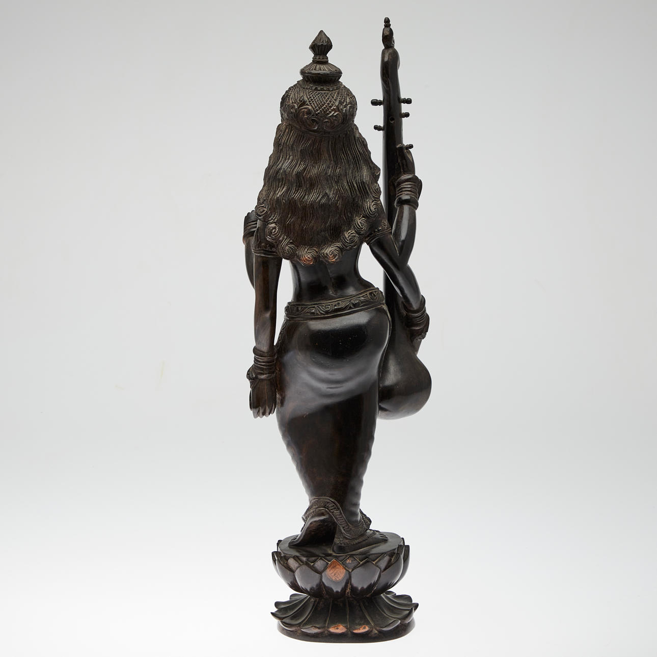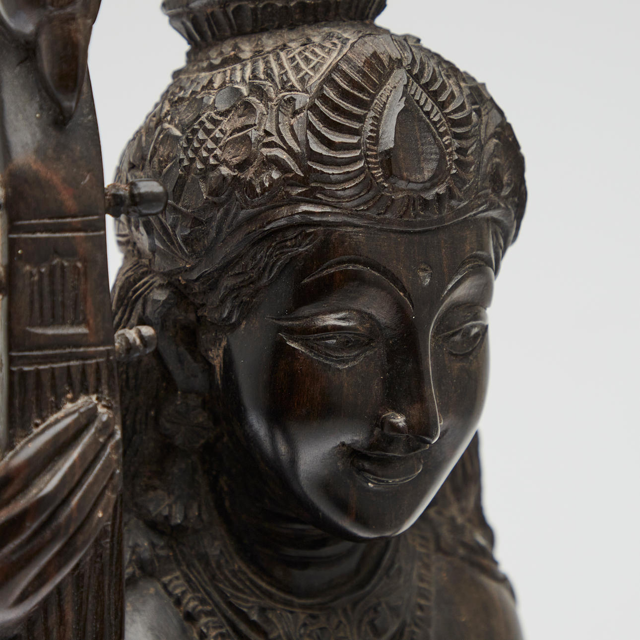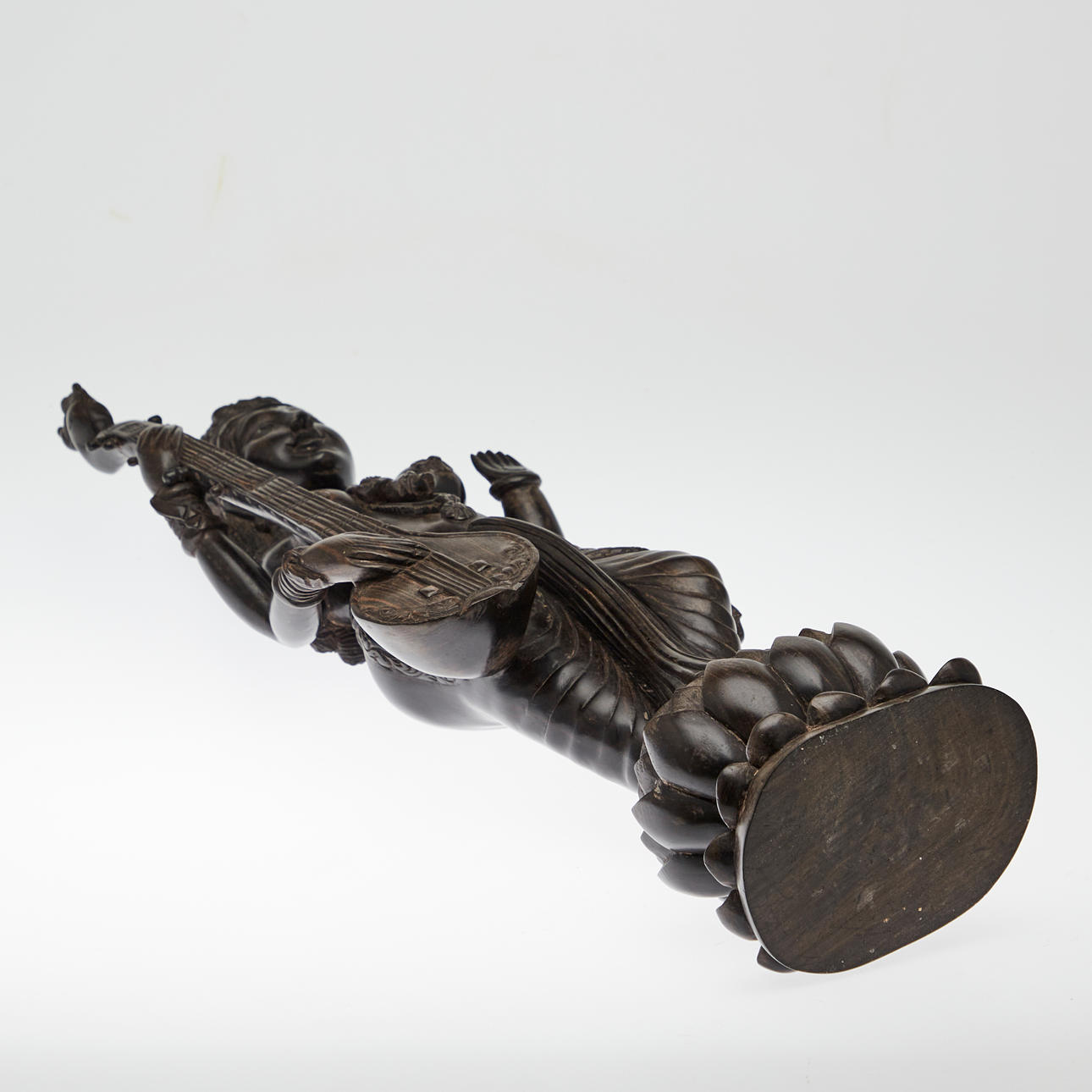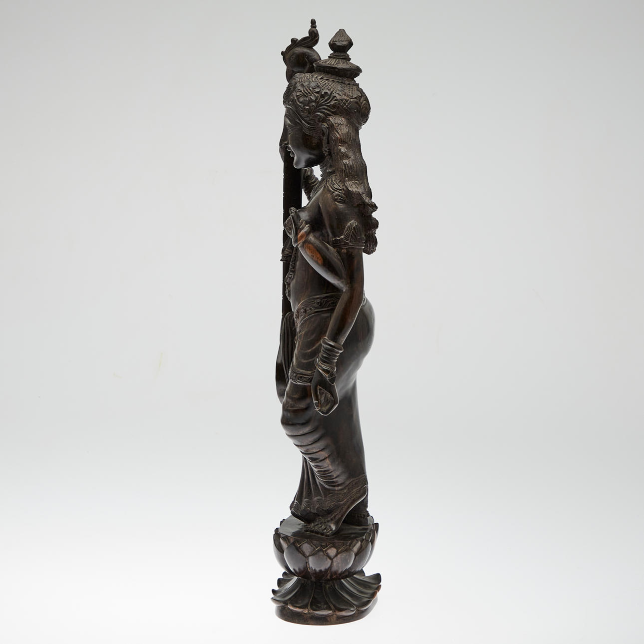 Figur / Skulptur, Sarasvati mit Laute, Holz. Holzfigur mit der Darstellung der hinduistischen Gottheit Sarasvati mit einer Laute in der Hand und Segensgestus, auf einer Lotusblüte, H.60cm, B.18cm, T.10cm.