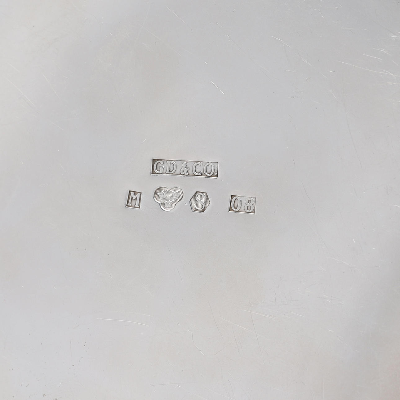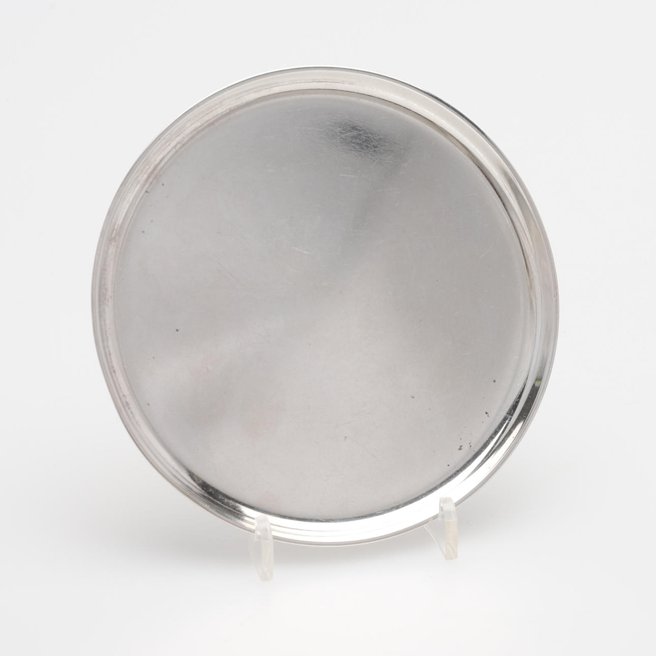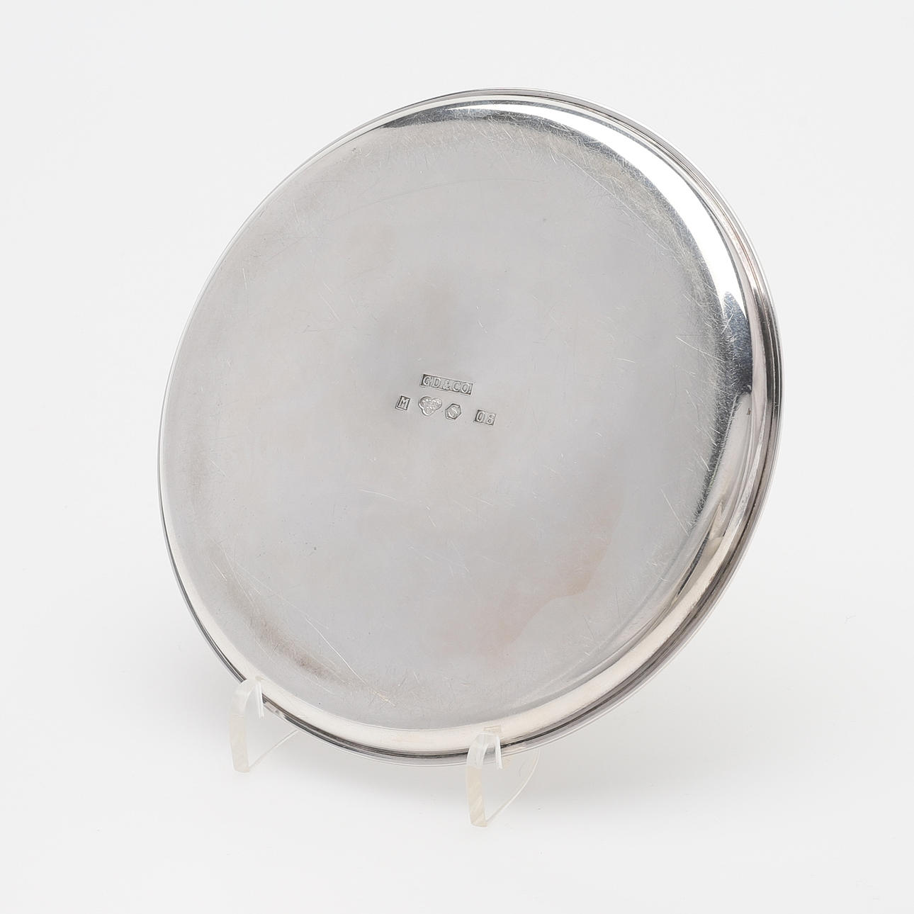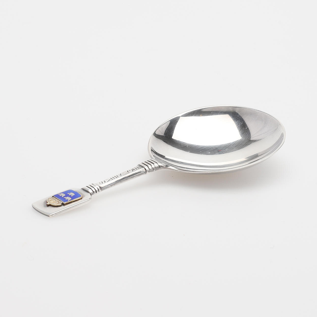 Silber: Weinuntersetzer gestempelt Gustaf Dahlgren & Co, Malmö 1940, Durchmesser 13 cm und Suppenlöffel mit kleinem schwedischen Wappen und Text „SWEDEN“, gestempelt Carl Gustaf Hallberg, Stockholm 1961, Länge 13 cm, Gesamtgewicht 150 Gramm.