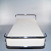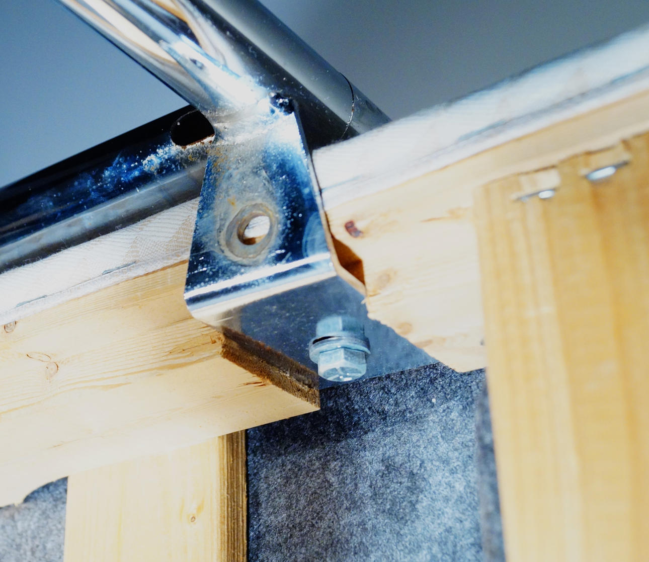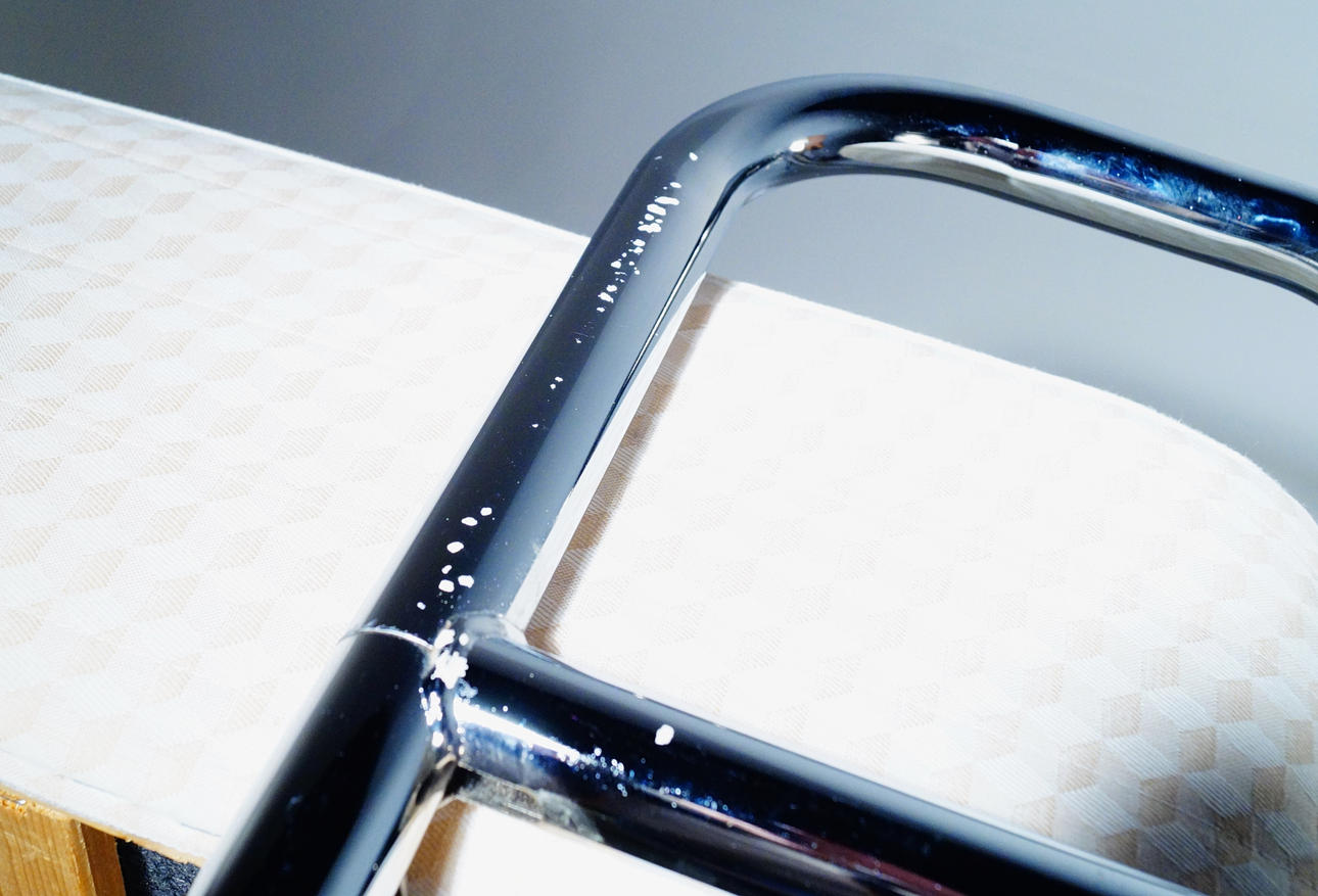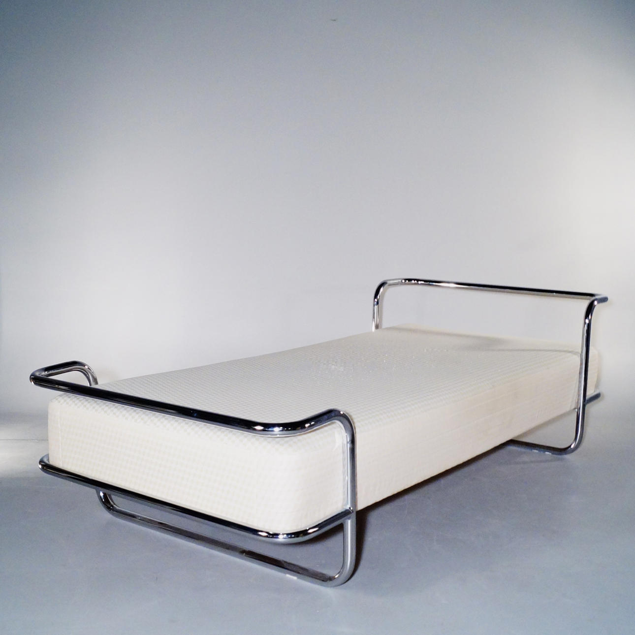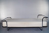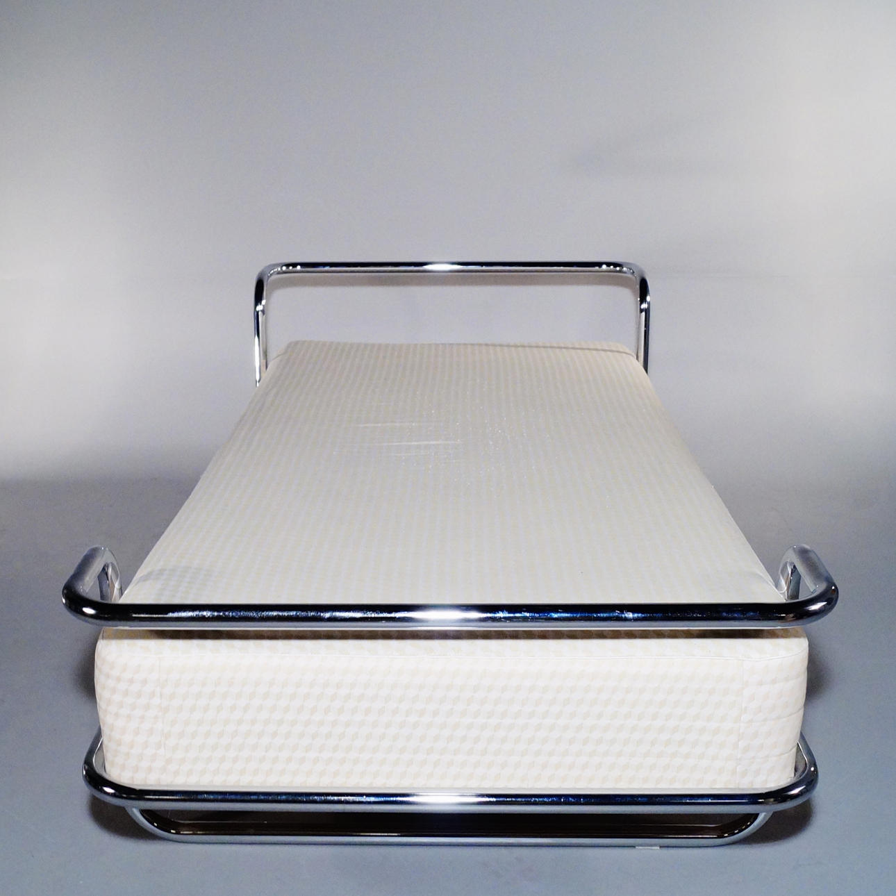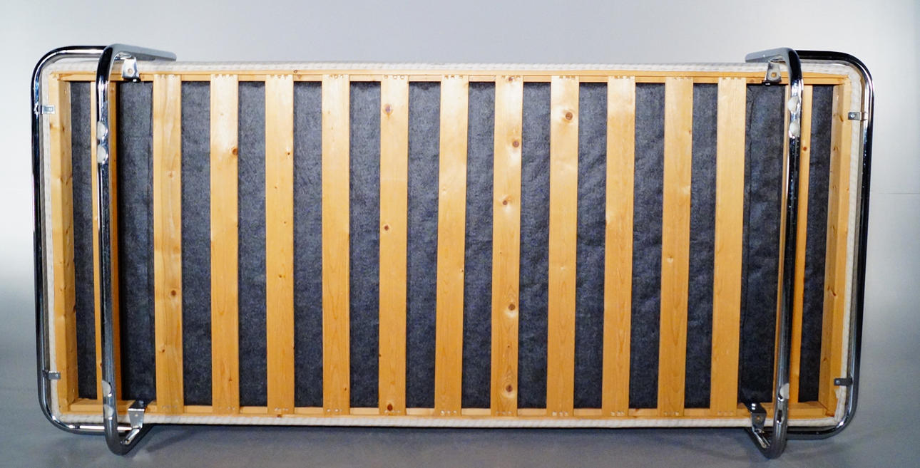 Zweiteilige Giebel aus verchromtem Stahlrohr, einer hoch und einer niedrig. In die Matratze eingeschraubt, siehe Foto. Maße Matratze „Sultan“, 90 x 200 cm, Außenmaße Rahmen 99 x 211 cm.