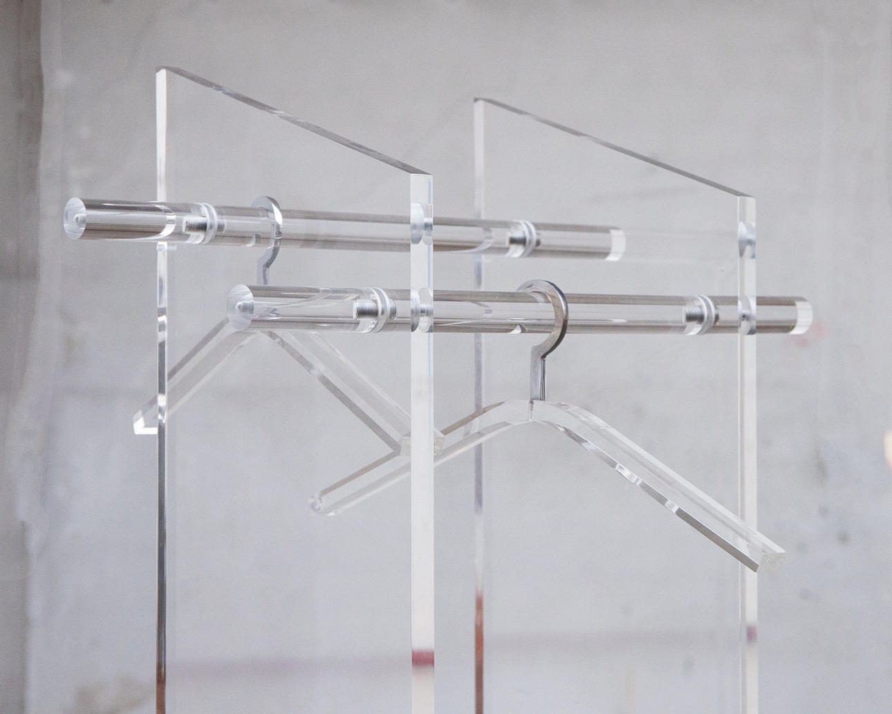 Garderobe der 1970/80er Jahre. Konstruktion aus Plexiglas / Acryl und verchromtem Metall. Ausgestattet mit zwei passenden Bügeln. H. 182, B. 50, T. 50 cm.