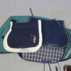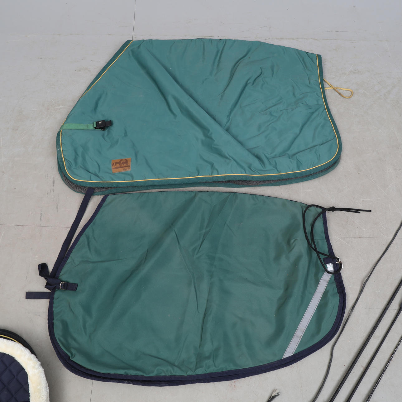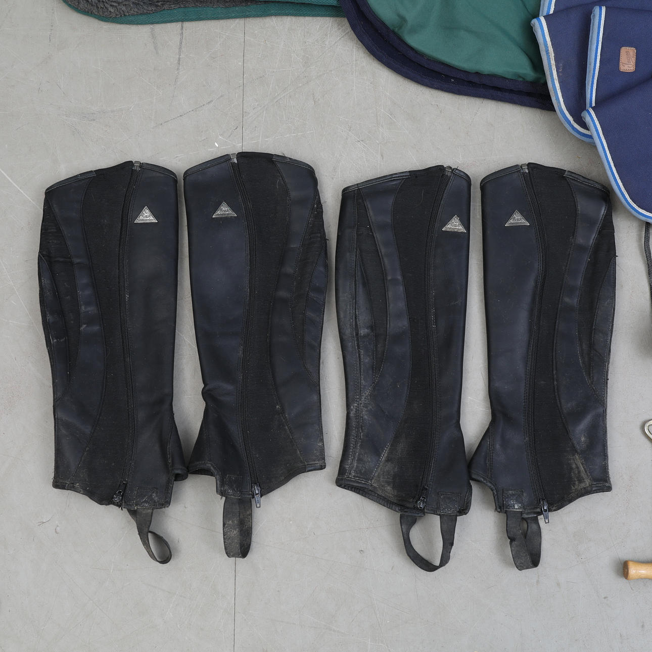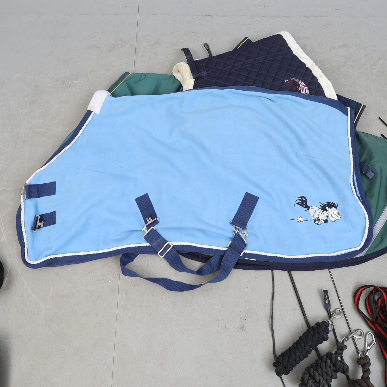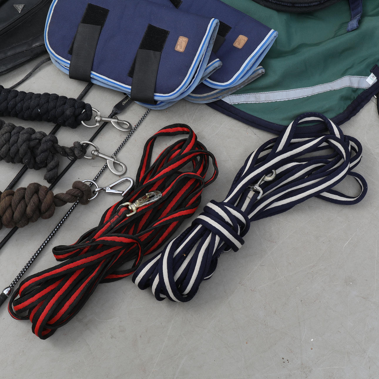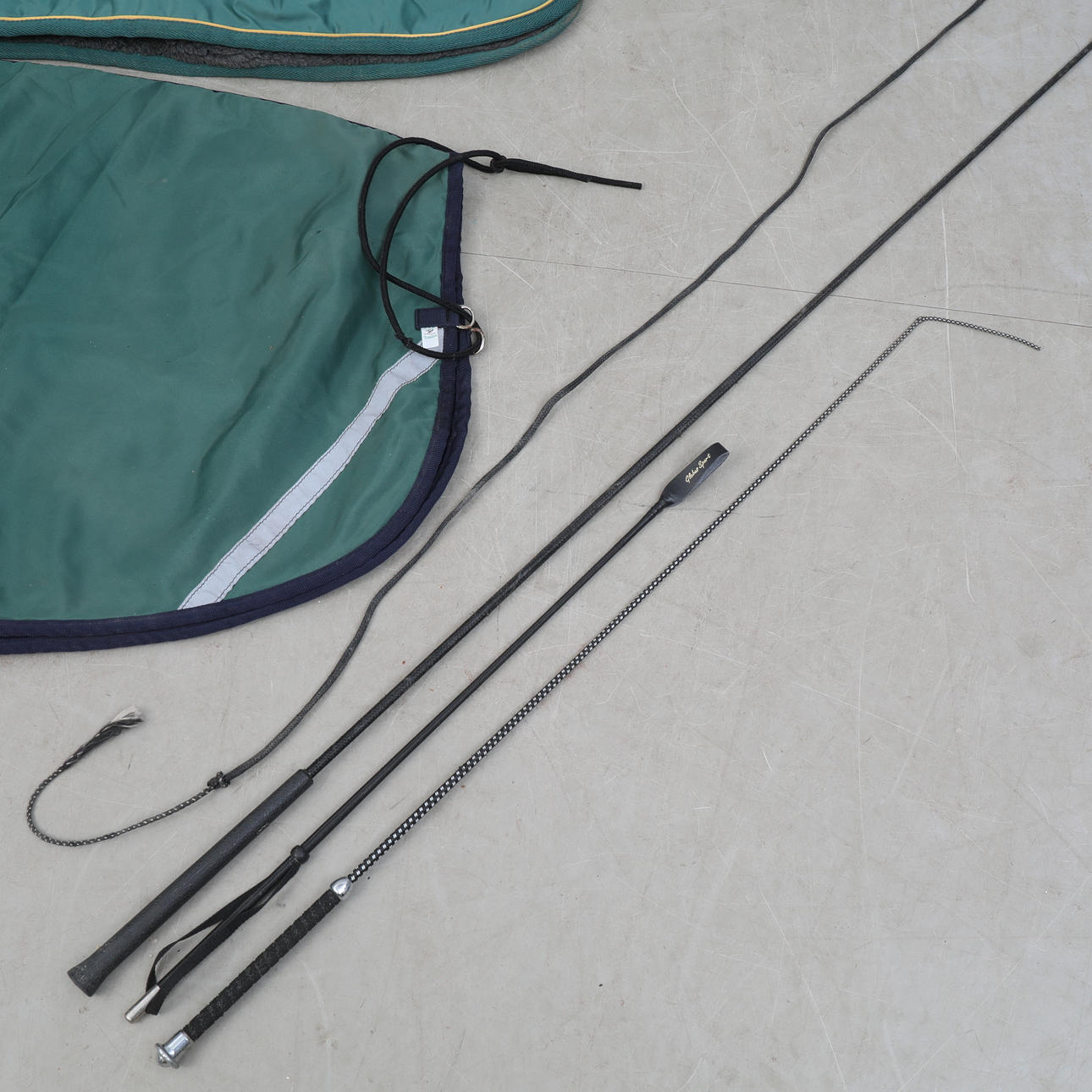Herbstliches Sportzubehör, speziell zum Reiten. Lendendecke, Ponydecke (mit Meerbarbe), Neckholder, Säbel, Langleinen, Shortchaps (Bergpferd), Schabracke, Beinschutz, Langpeitsche usw.