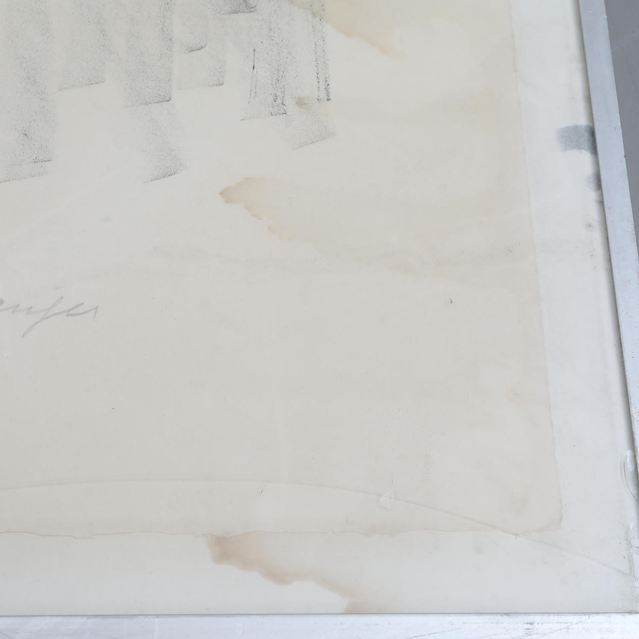 Nicht außerhalb des Rahmens untersucht, Glas beschädigt, Feuchtigkeitsflecken, Schmutz.