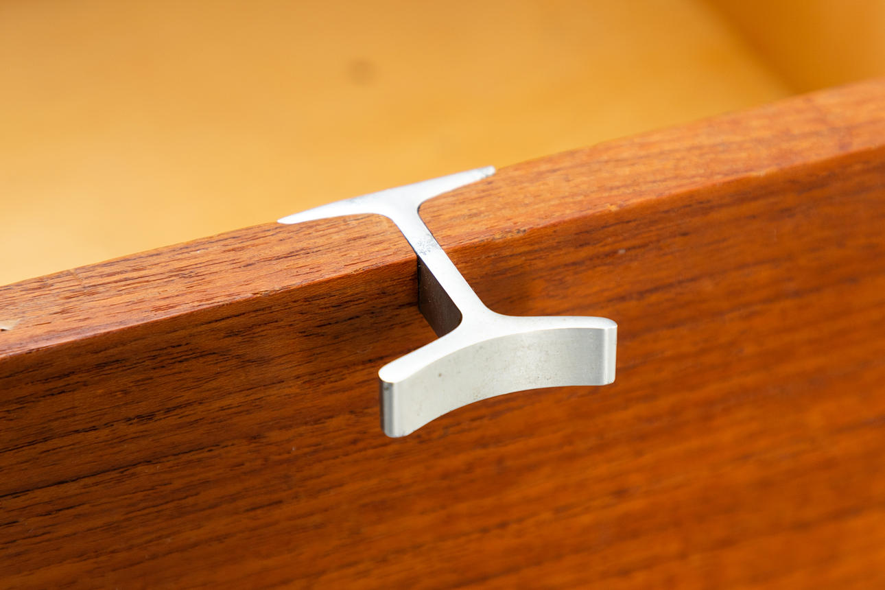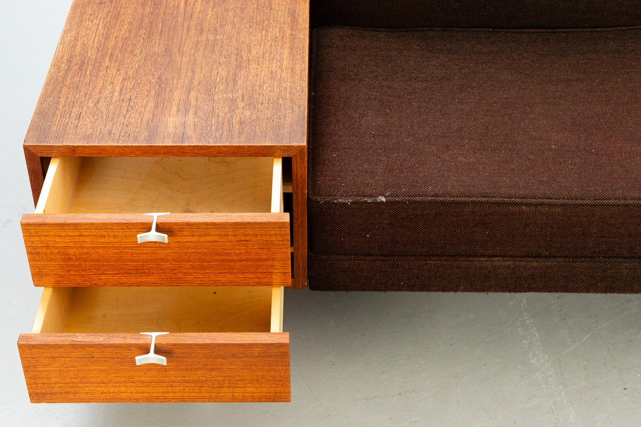 Vierkanstahlrohr, verchromt, teils schwarz lackiert. Mit einem Beistelltisch / Kommode mit 3 Schubladen in Teak und Metallgriffen.