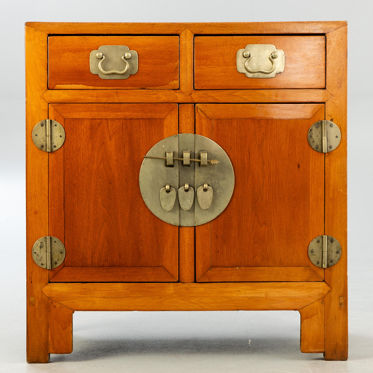Holz/Metallapplikationen. Zwei Schubladen u. zwei Flügeltüren. Türriegel vorhanden. HxBxT: ca. 93,5 x 88 x 50 cm.