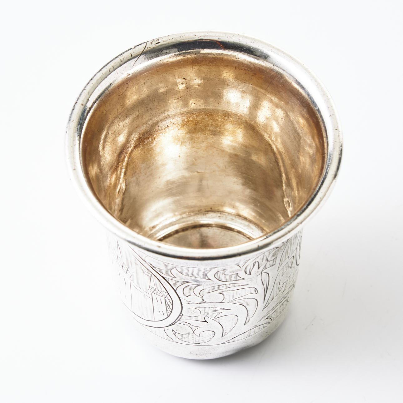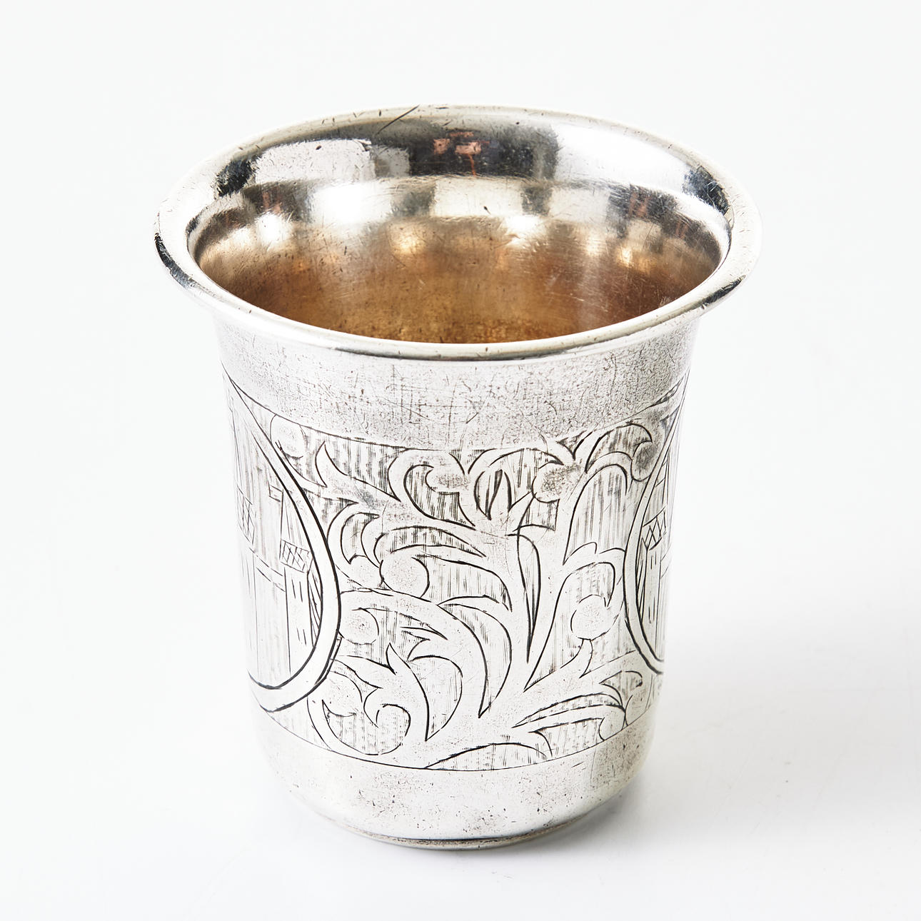 Gravierdekor mit Blattschlaufen und Stadtmotiven, unbekannter Meisterstempel, Moskau vor 1733, Höhe 6,5 cm.