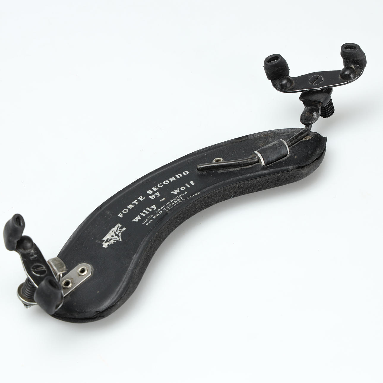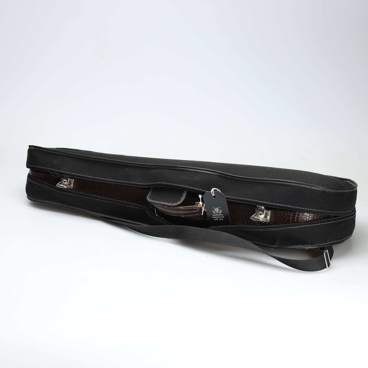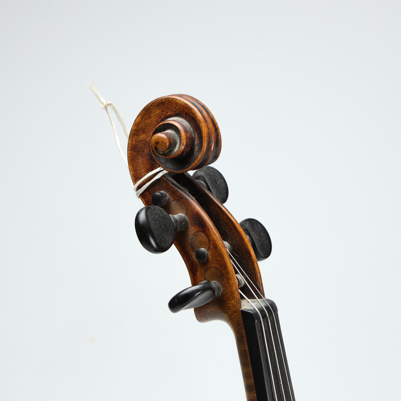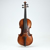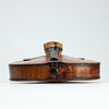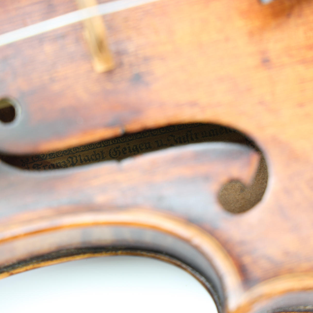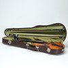 Geige; Sarg mit Entriegelung und vorheriger Reparatur im Bereich des Knopfes, am deutlichsten an der linken Korpushälfte. Verstecktes Gehäuse mit neuen Löchern für Stellschrauben. Deckel mit entfernter Vernissa mit matter Oberfläche. Verpulvend mit rissiger linker Griffbrettseite.