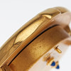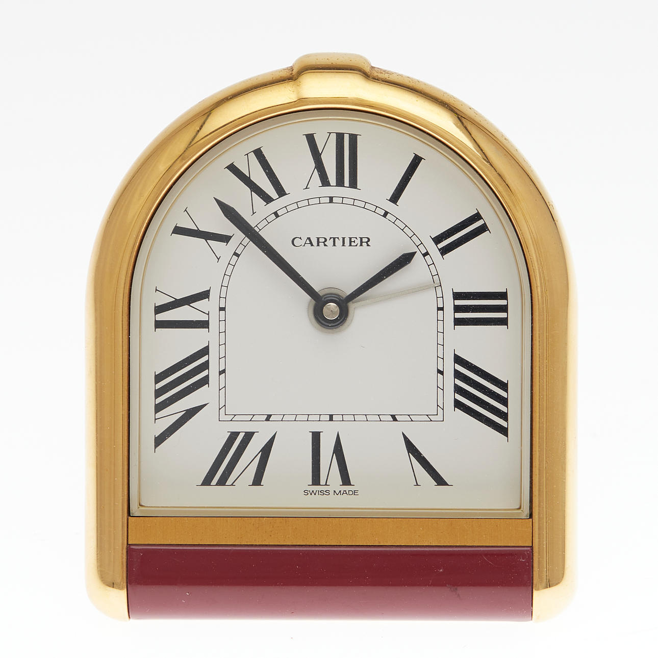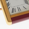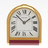 Cartier, Reisewecker / Wecker, Messing, um 2002, Schweiz. Klappbarer Reisewecker mit einem Gehäuse aus goldfarbenen Edelstahl, mit einem weißen Ziffernblatt mit römischen Zahlen, mit Stunden- und Minutenzeiger sowie Zentralsekunde, H.8,7cm, B.7,5cm.
