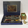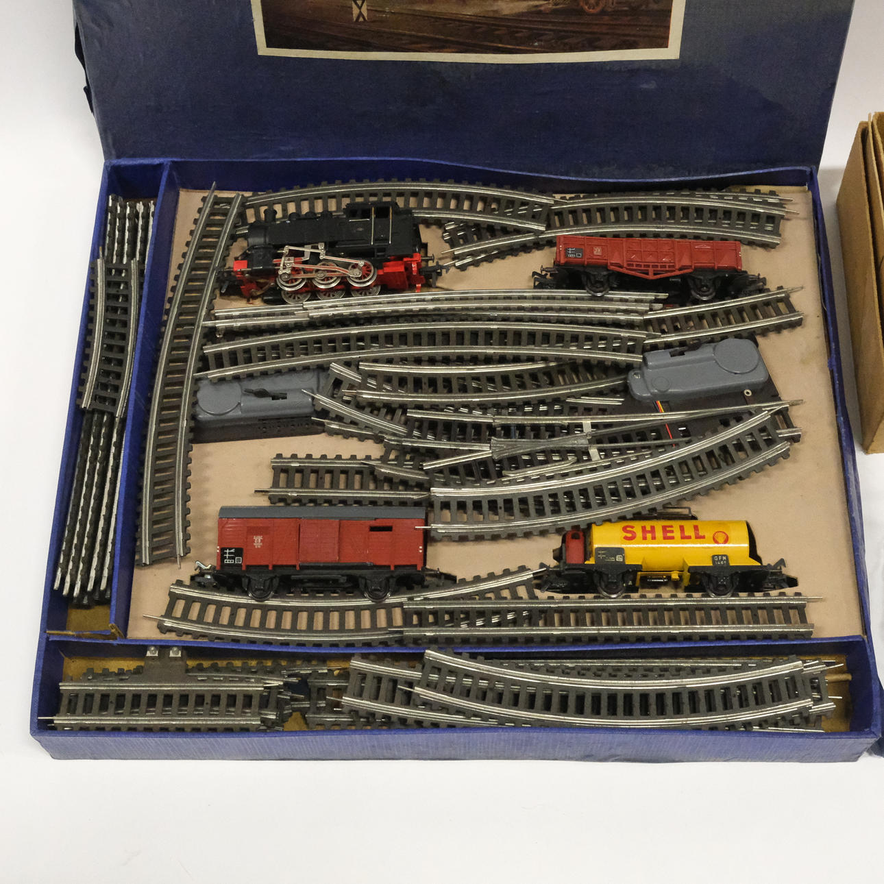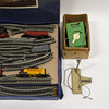 Bahngleis im Originalkarton, bestehend aus: Lokomotive, drei Waggons und Gleisen.