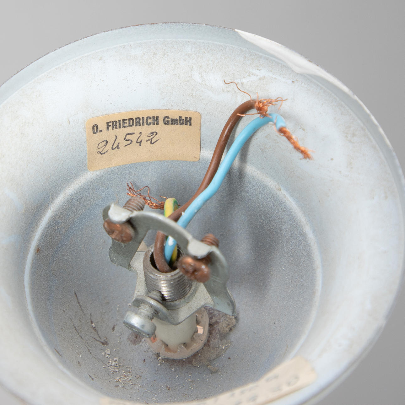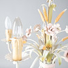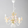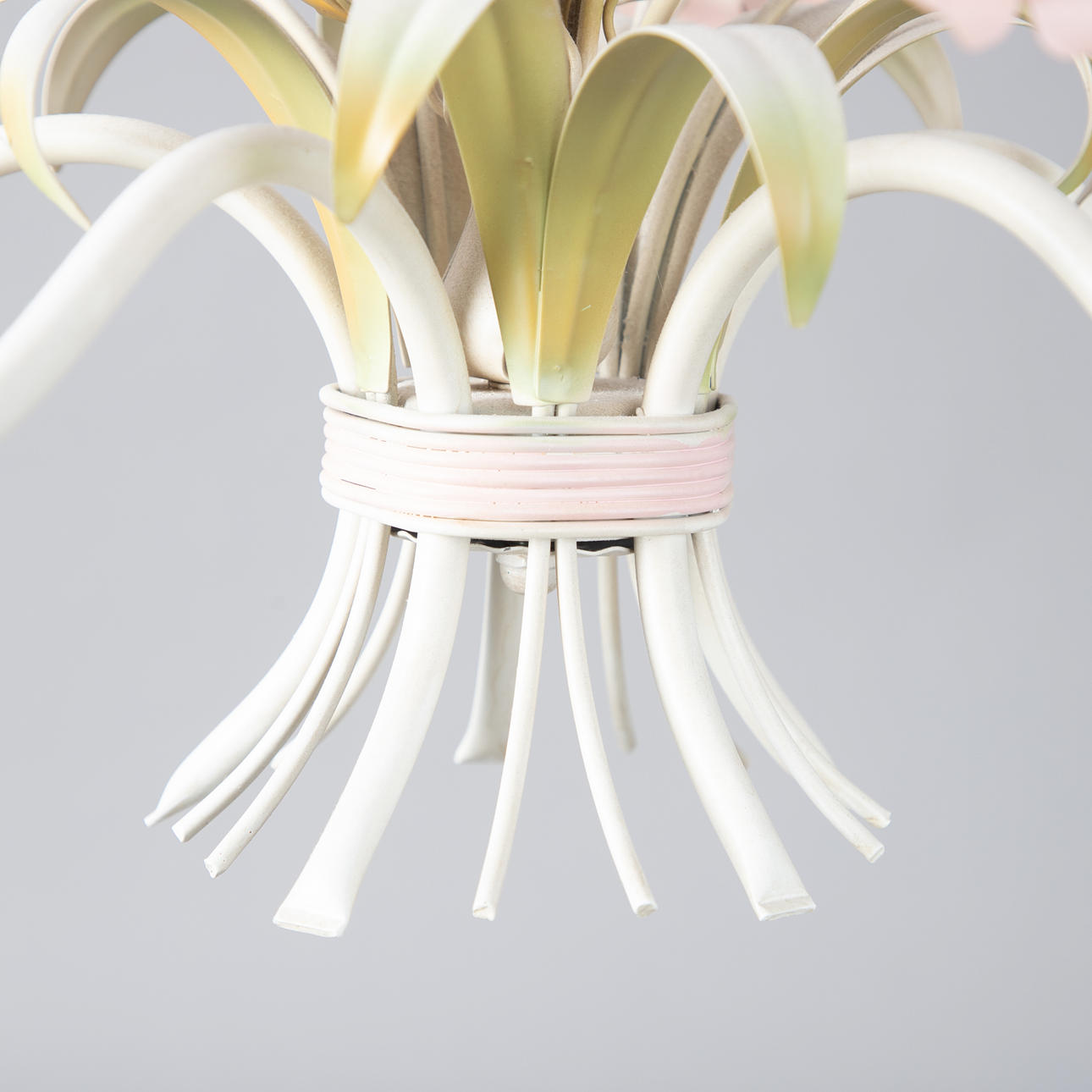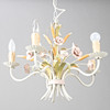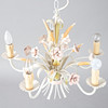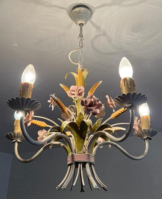 Kronleuchter / Deckenleuchte, Metall, Kunststoff, 20. Jh. Konstruktion aus lackiertem Metall mit geschwungenen Armen und floraler Rankenornamentik. 5 Brennstellen, E14 Fassungen und Kerzenhülsen aus Kunststoff. Mit Herstelleretikett bezeichnet 'O. Friedrich GmbH'.