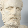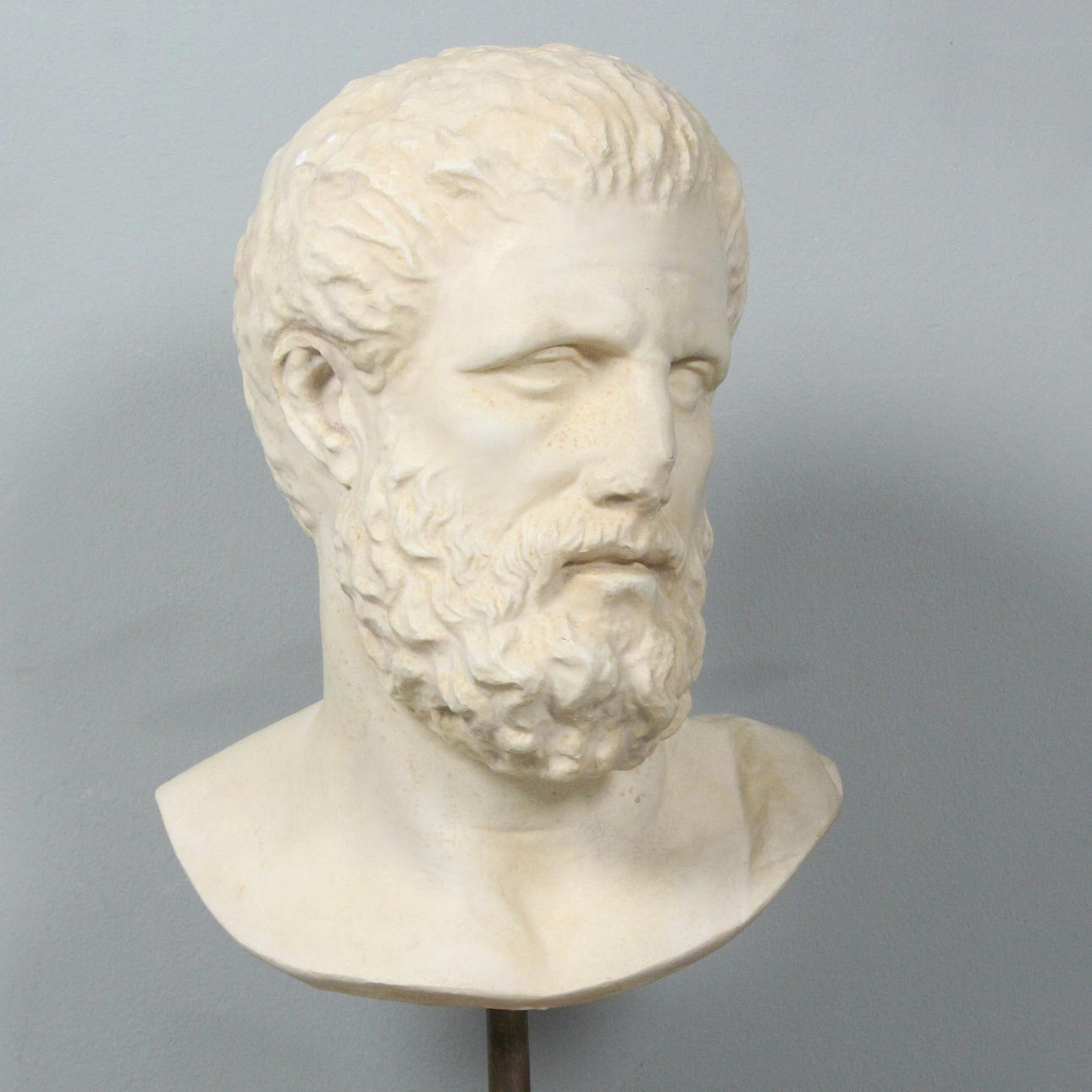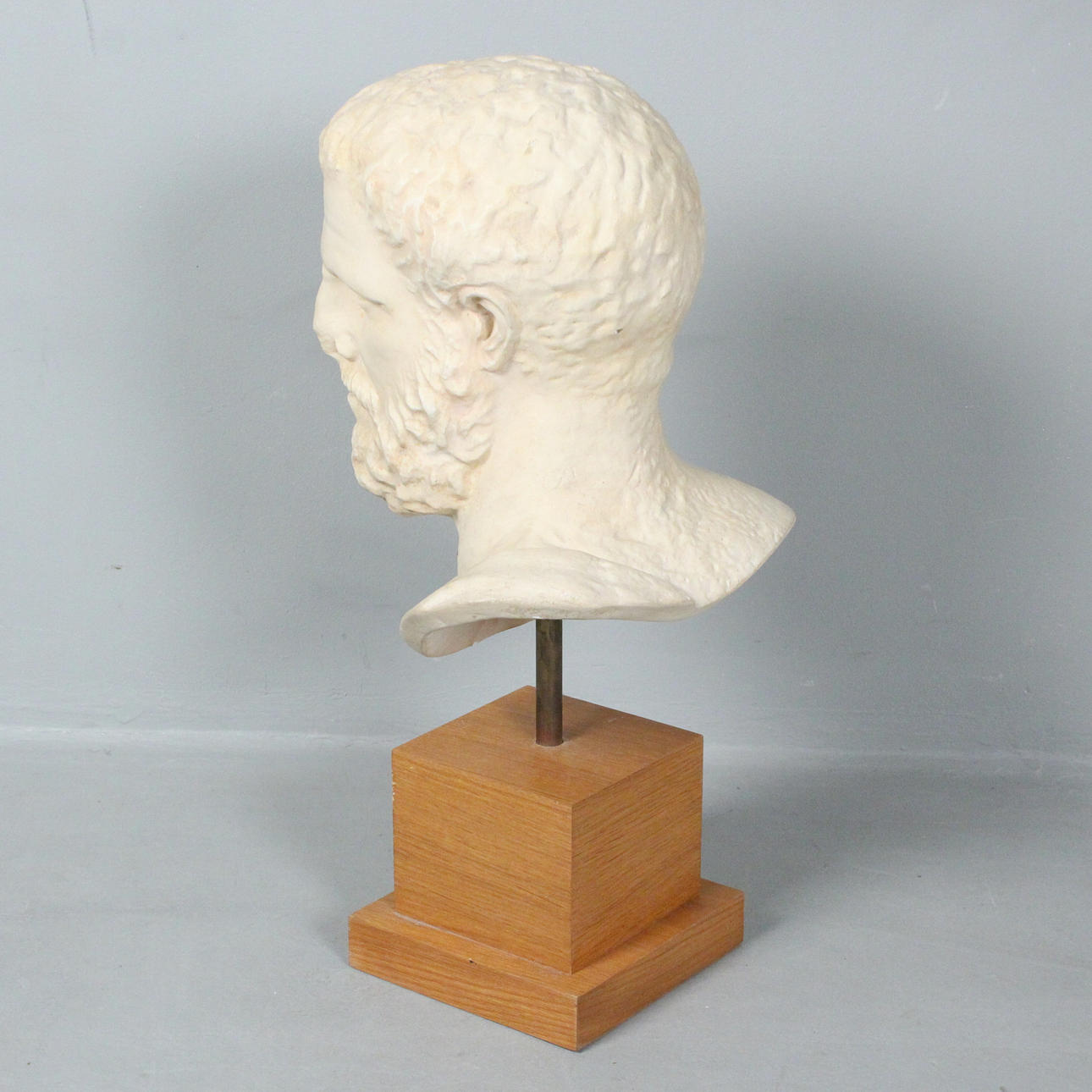 Skulptur / Figur aus Gips, Büste von Aristoteles, aus Holzsockel gesteckt, mit Plakette versehen, Maße ca.: H. 68 cm, B. 33 cm, T. 27 cm.