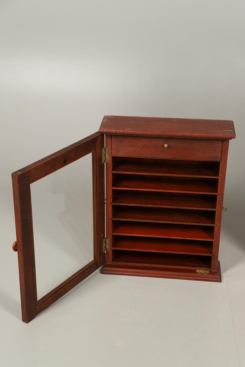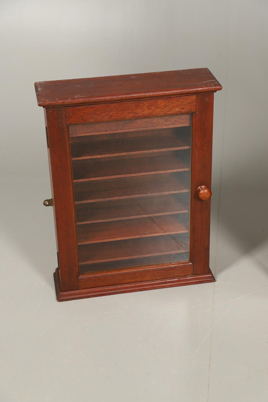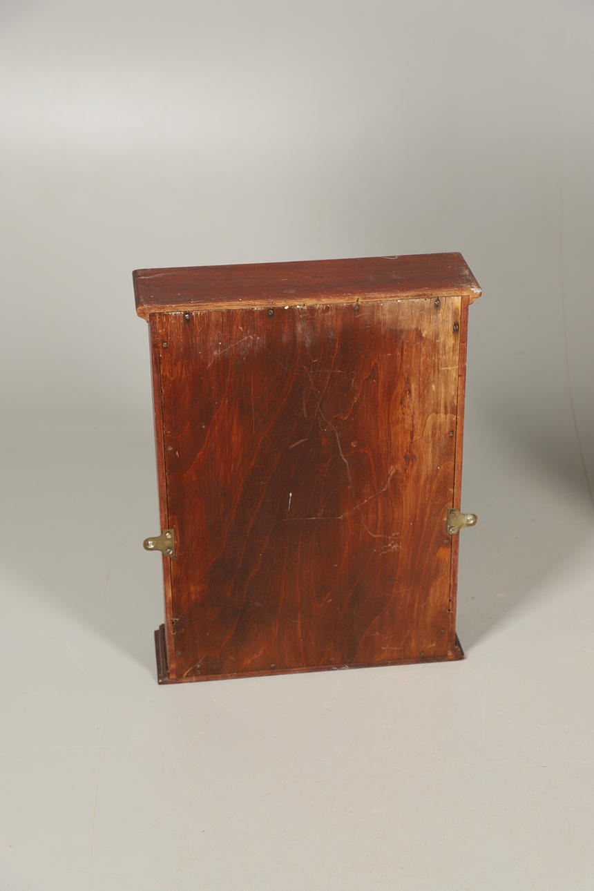 Der andere eintürige Schrank umschließt Regale, 52 cm hoch x 40 cm breit x 12 cm tief.