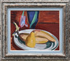 „Birne und Banane“, Öl auf Holz, laut rückseitig signierter Text 1939. 32 x 40 cm.