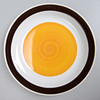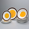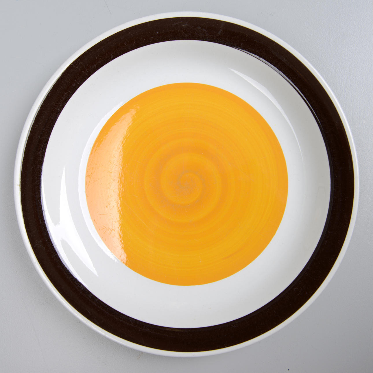 Handbemaltes Dekor, braunes Band und gelber Spiegel. Feuersteinwaren. 1 Speiseteller, 7 tiefe Teller, 6 Beilagen.