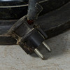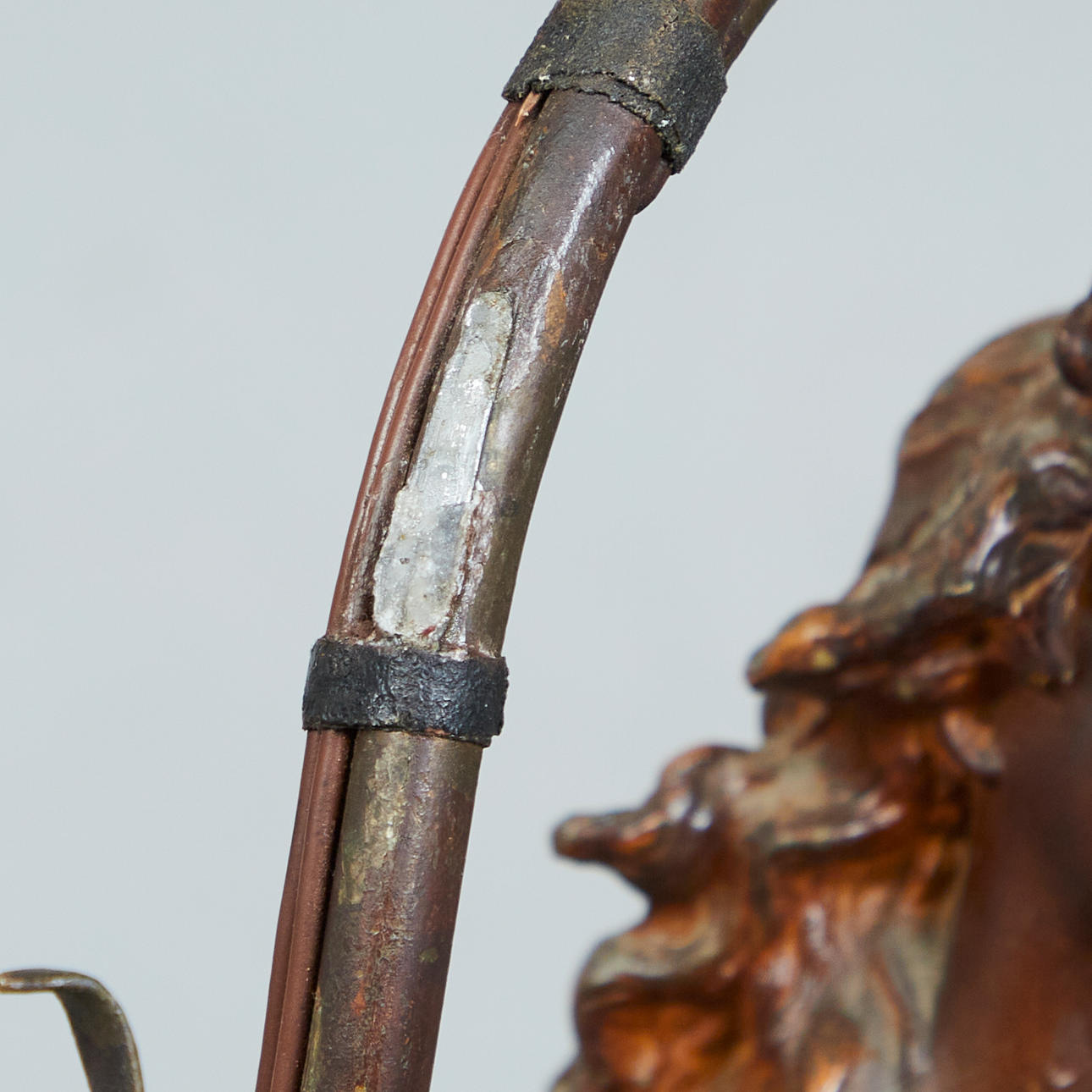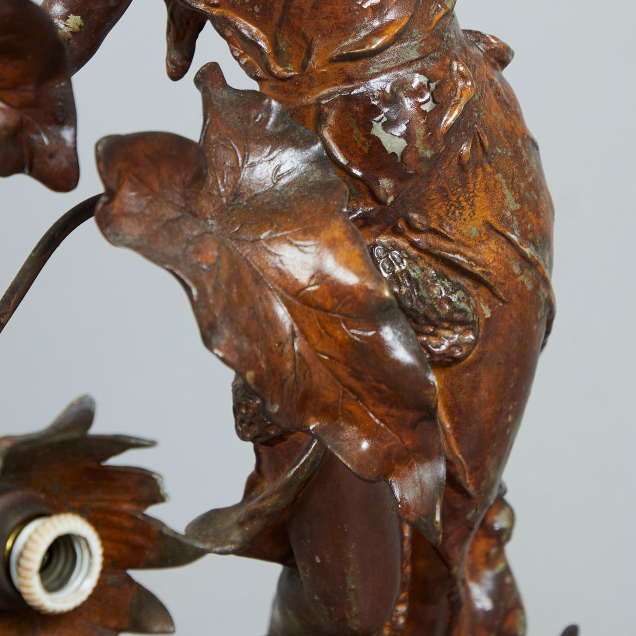 Stehleuchte mit einem Korpus aus Metall mit der Darstellung einer Najade mit Blätterranken, an diesen mit drei Brennstellen versehen, auf einem zweistufigen Sockel aus schwarzem Marmor mit weißer Äderung und einem dunkelbraun lasierten Sockel aus Holz montiert, H.83cm, L.24cm, T.24cm.