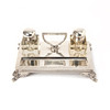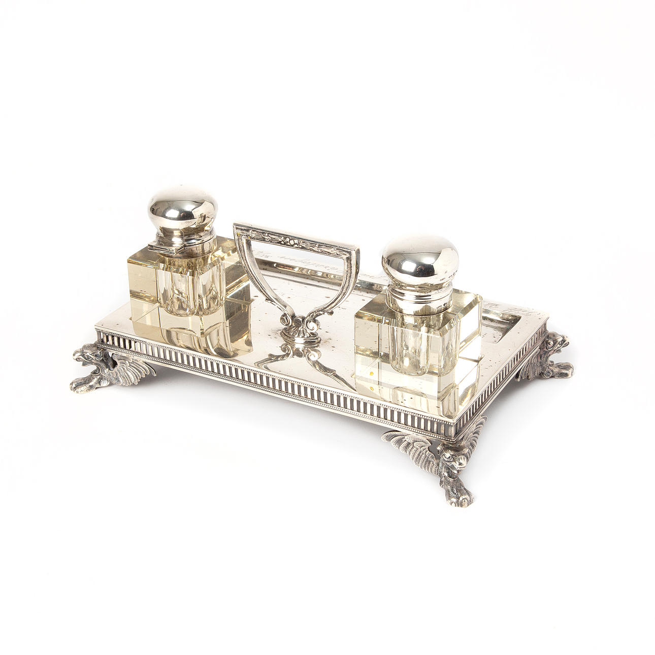 Zwei Glas-Tintenfässer mit silbernem Deckel. Tablett in Silber mit Taubenfüßen von fabelhaften Tieren.