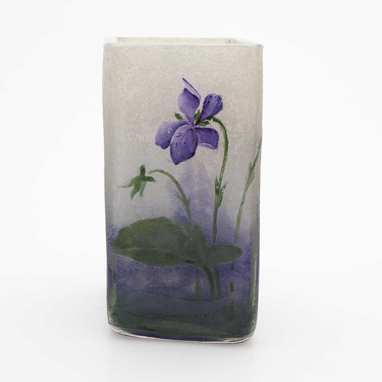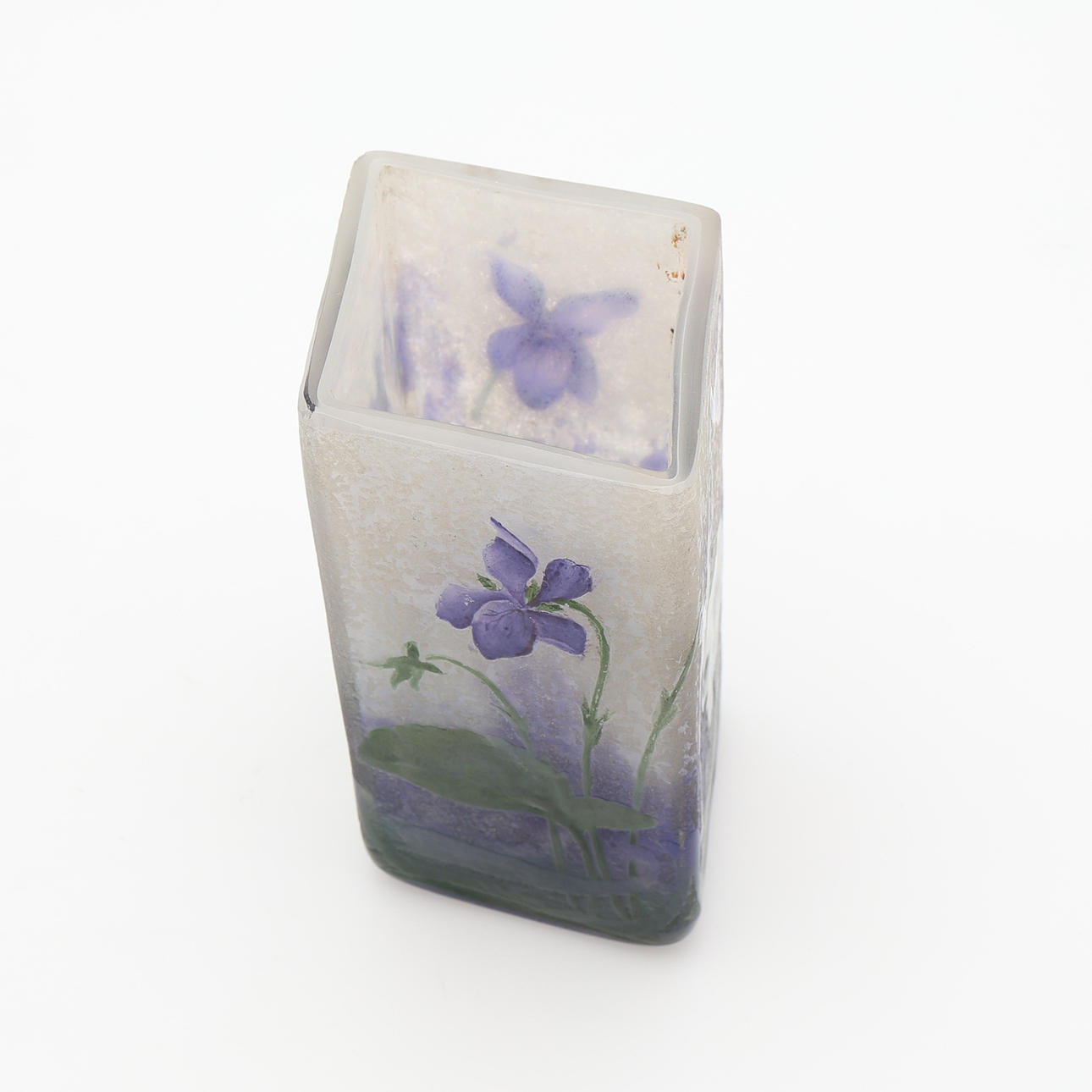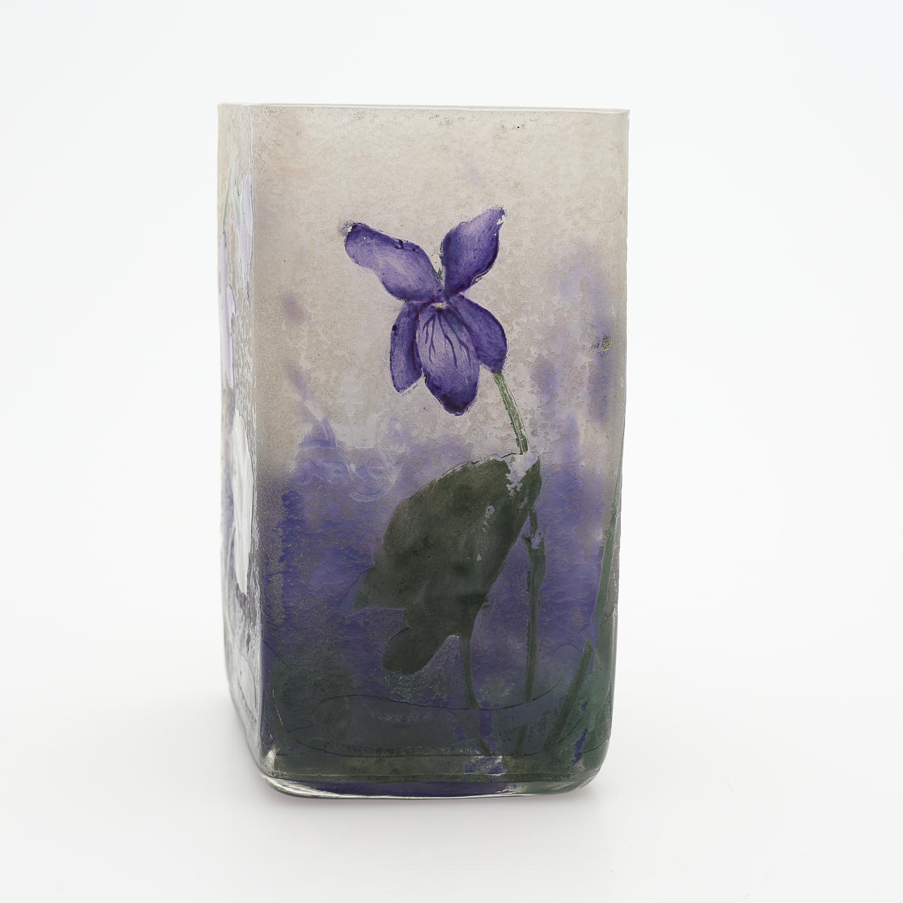 Jugendstil, vierseitige Rautenform, meliertes Glas in weiß, blau und grün mit geätztem Dekor, das Veilchen darstellt, signiert „DAUM NANCY“ und mit dem lothringischen Kreuz, Höhe 10,9 cm.