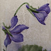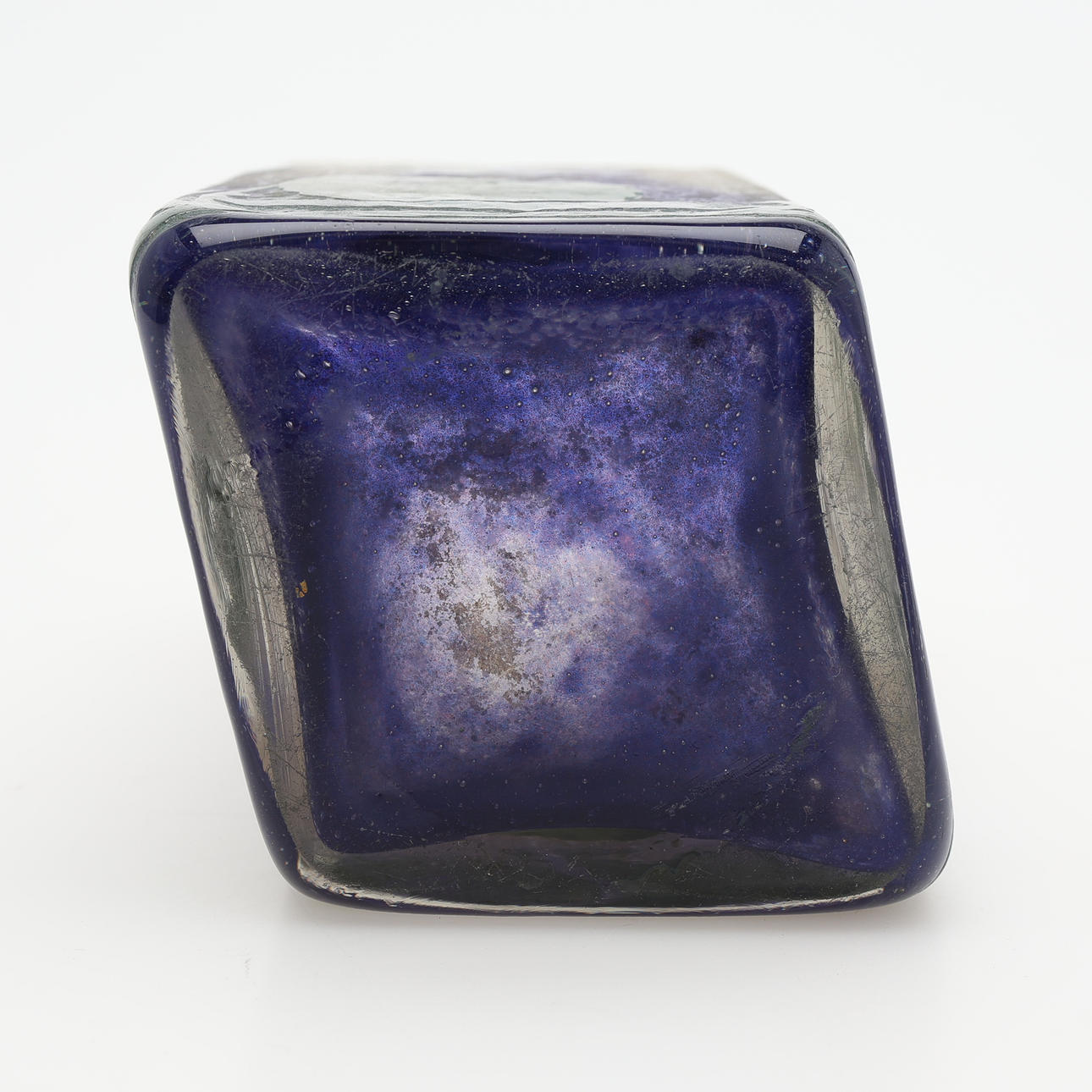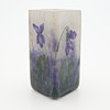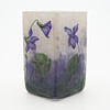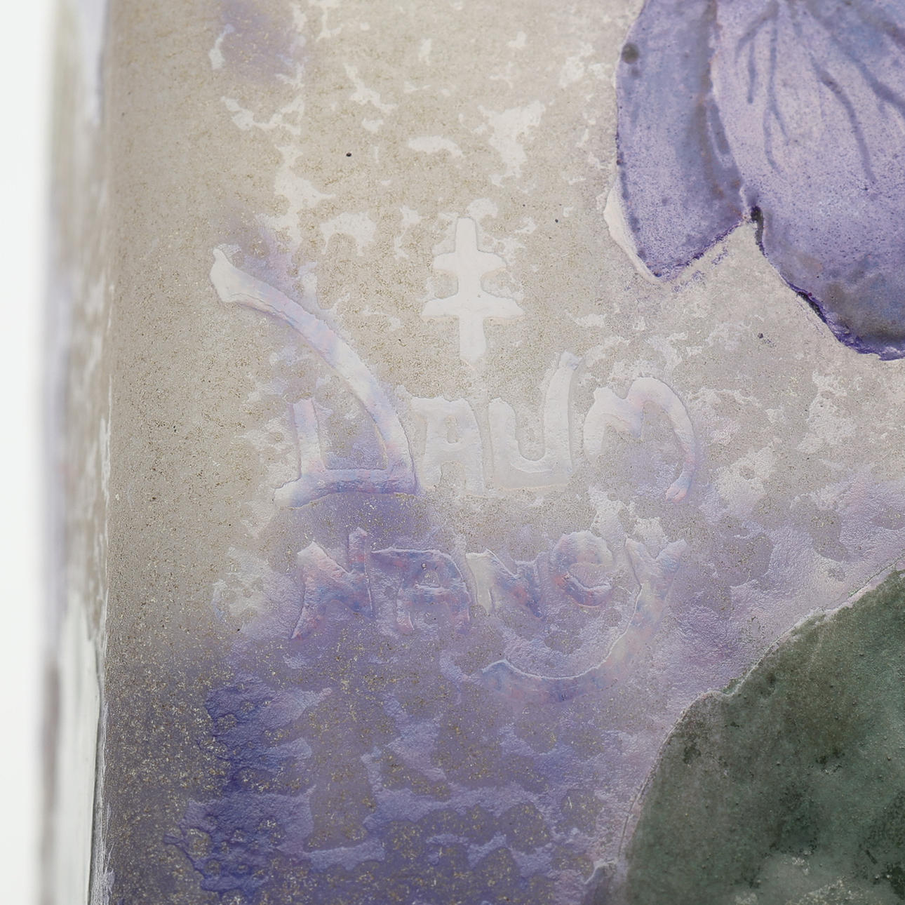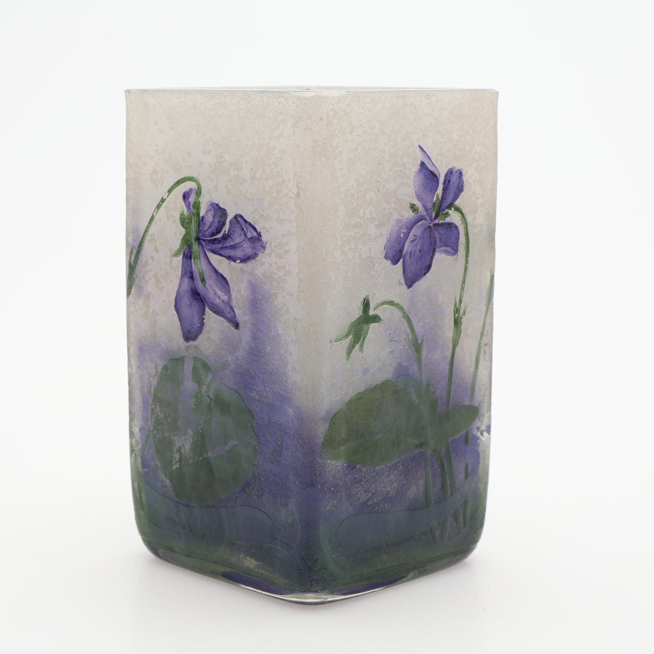 Jugendstil, vierseitige Rautenform, meliertes Glas in weiß, blau und grün mit geätztem Dekor, das Veilchen darstellt, signiert „DAUM NANCY“ und mit dem lothringischen Kreuz, Höhe 10,9 cm.