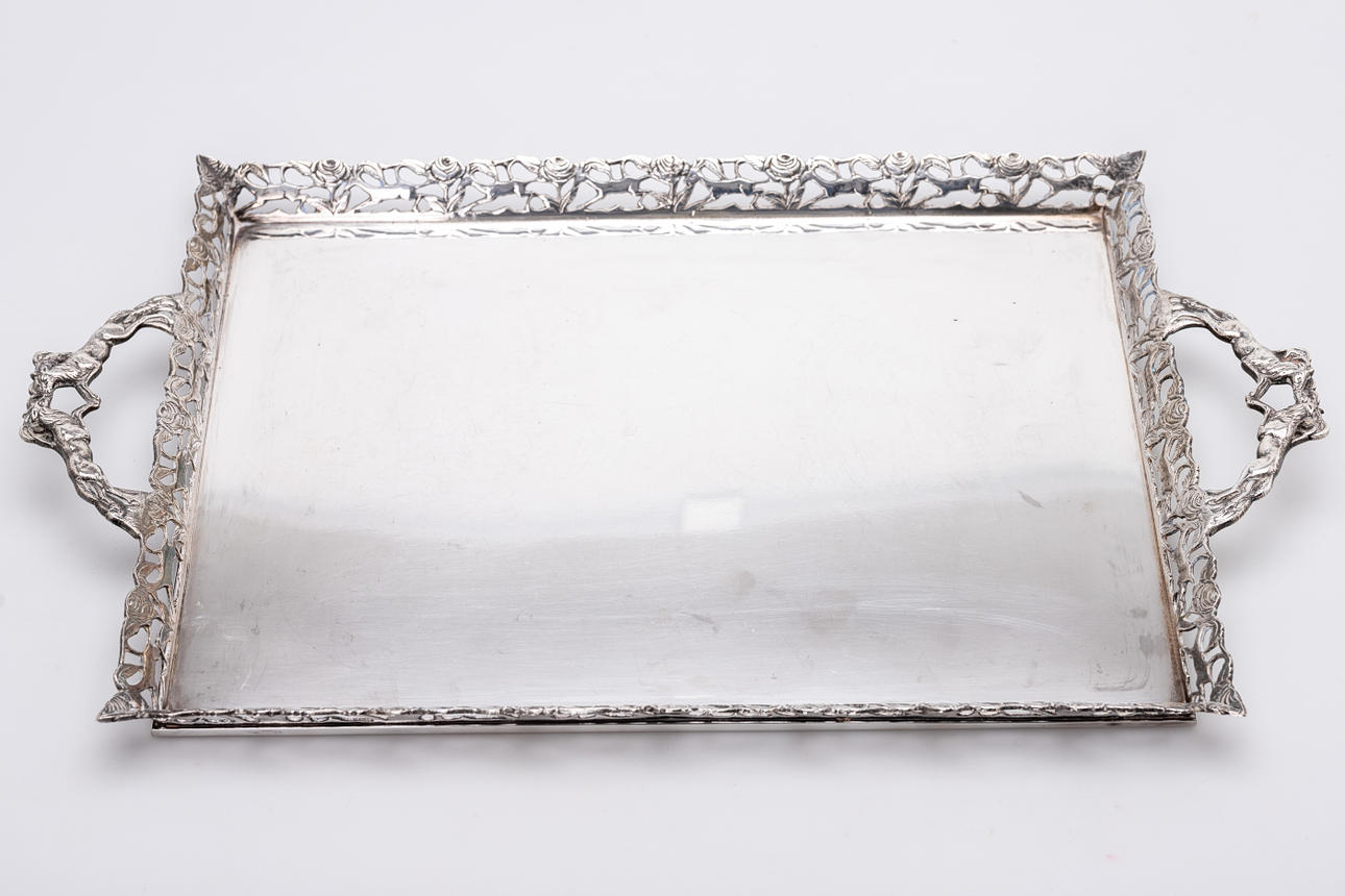 Silber (geprüft). Rechteckiger, glatter Spiegel. Der leicht nach außen gebogte Rand mit alternierendem Rotwild- und Rosen-Durchbruchdekor. Handhaben als Rotwildrelierf. HxLxB: ca. 27 x 48 x 24 cm, ca. 1125g. . Hanauer Pseudostempel.