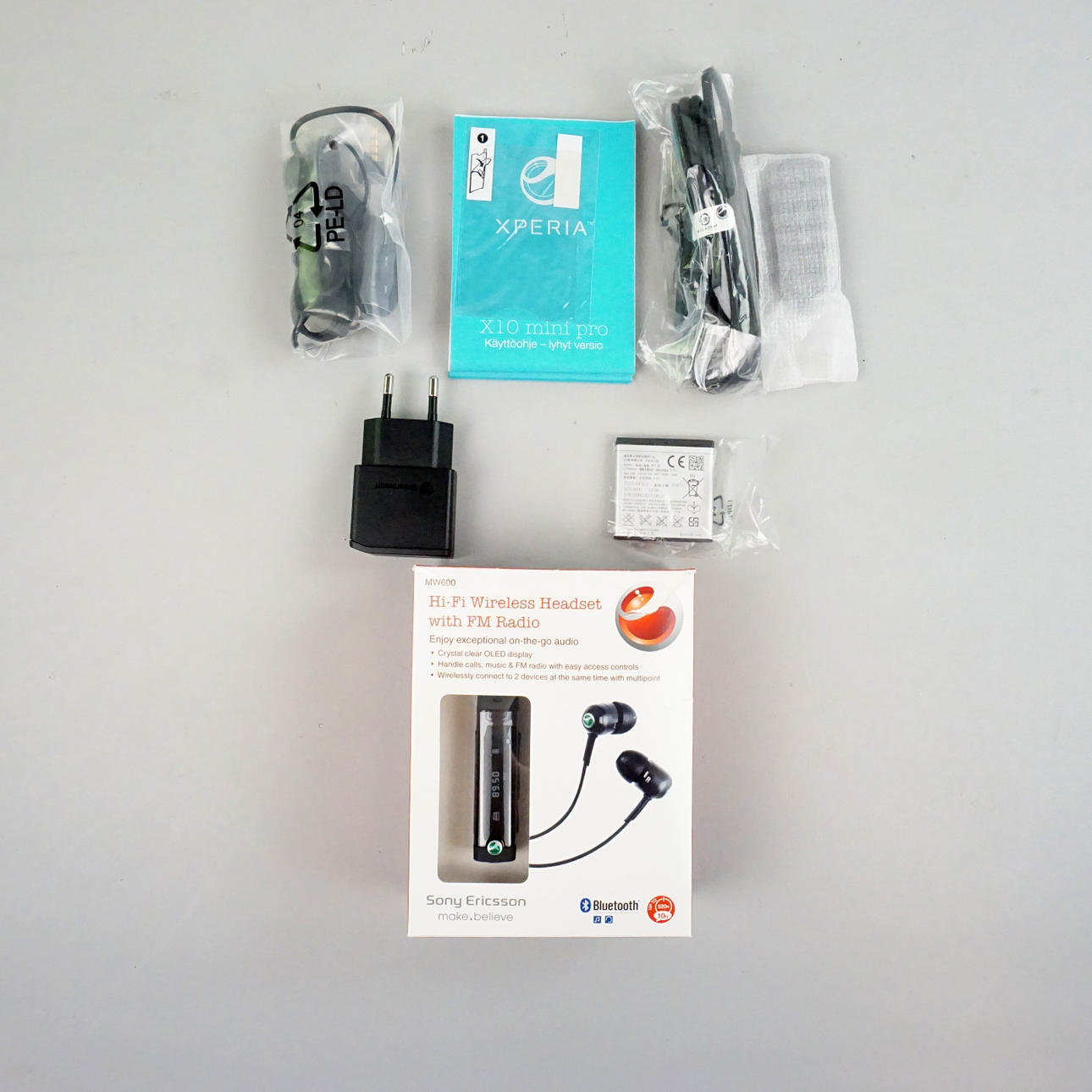 Ladegerät, Akku, USB-Stick und kabellose Kopfhörer sind im Lieferumfang enthalten.