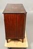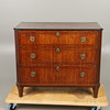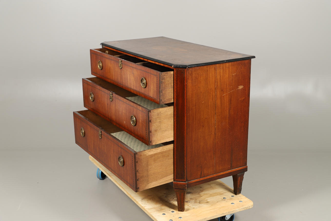 Die drei abgestuften Schublade mit vergoldetem Metallring verfügen über Ziehgriffe und mit Prunkeln verzierte Rosetten. Dekorative Intarsien und Details, hochgezogen an kurzen Beinen. Die obere Schublade ist innen in drei Fächer unterteilt. Höhe 84,5 cm x Länge 100 cm x Tiefe 51 cm.