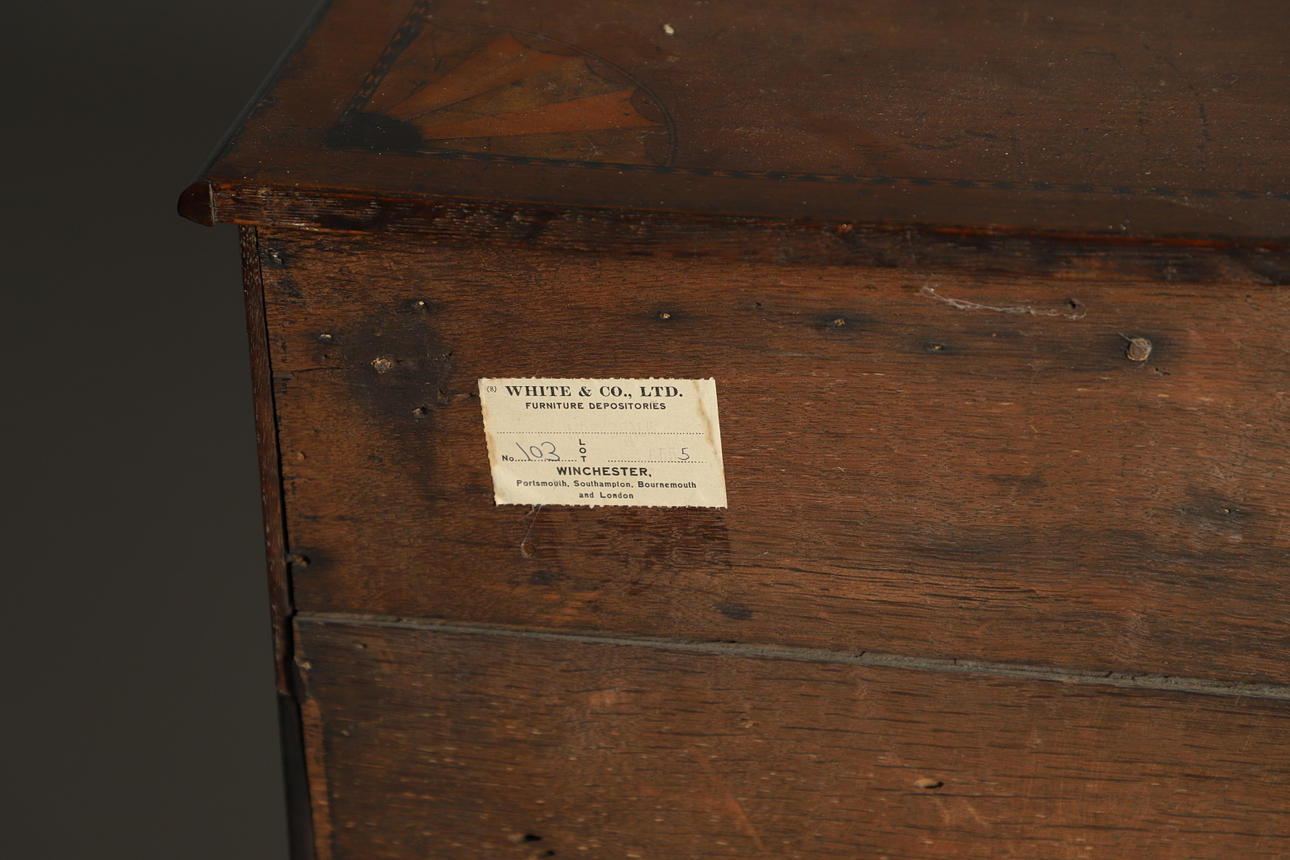 Allgemeine Gebrauchsspuren mit diversen Spuren, Kratzern, Verlusten und Rissen. Schublade laufen einigermaßen leichtgängig. Schließmechanismen, aber kein Schlüssel.