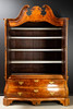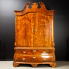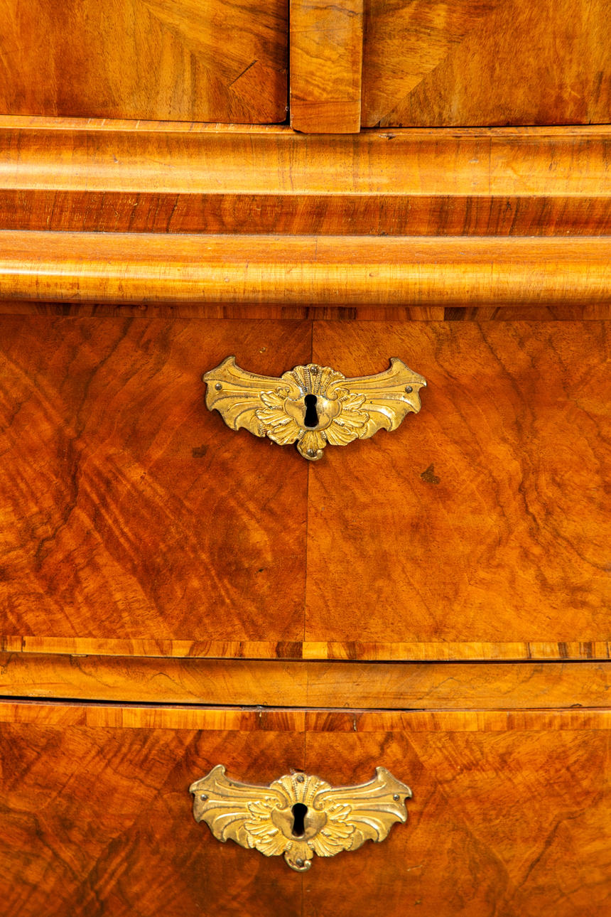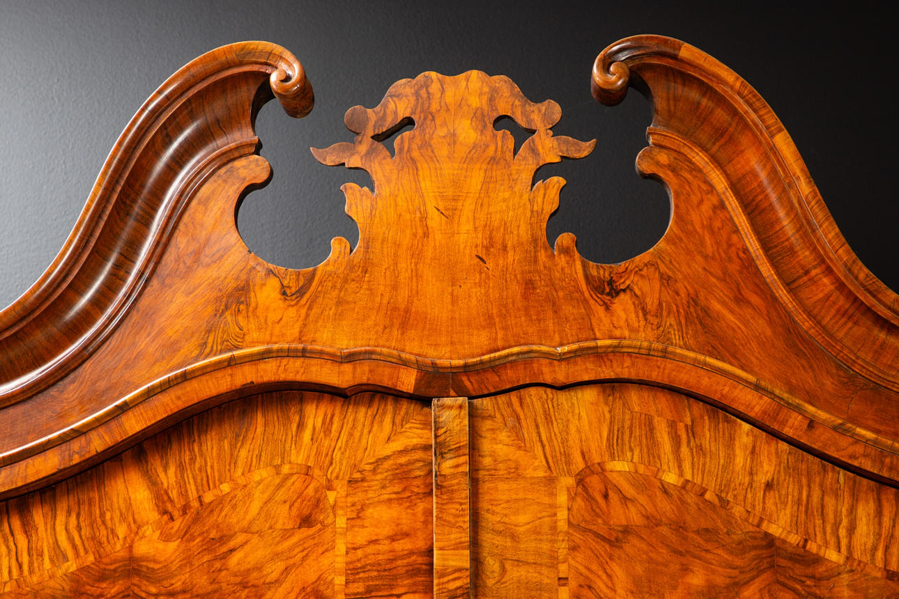 Nußbaum und Nußbaum Maser furniert. Zweiteiliger, gerader Korpus auf über Eck gestellten, teilweise ausgesägten Füßen. Die angeschrägten Lisenen auf die Bombierung der zweischübigen Kommode aufgreifend. Zweitüriger Aufsatz, die furnierten Füllungen korrespondierend mit dem gesprengten Giebel abschließend. Innen vier Einlegeböden. Türschloß fehlt. HxBxT: ca. 251 x 166 x 68 cm.