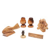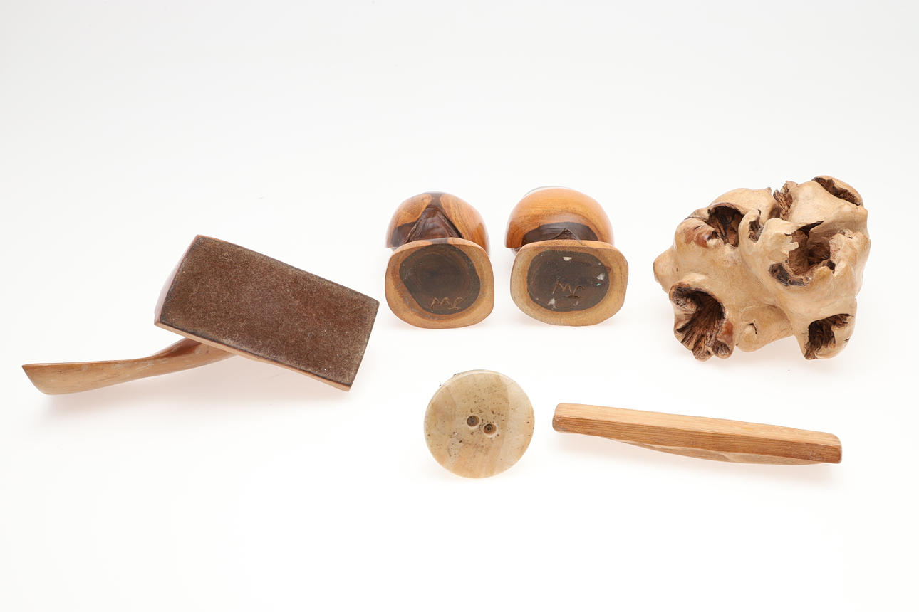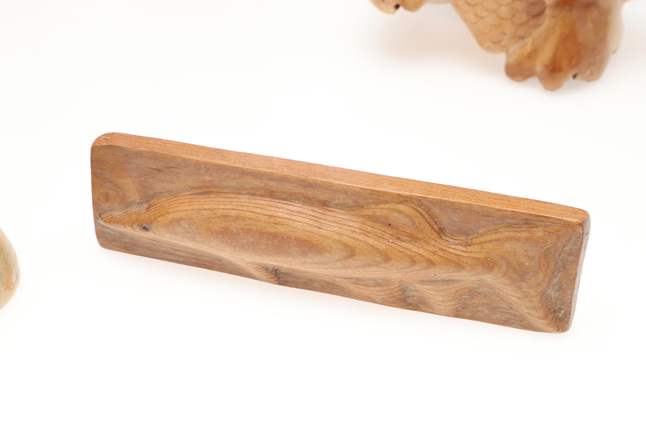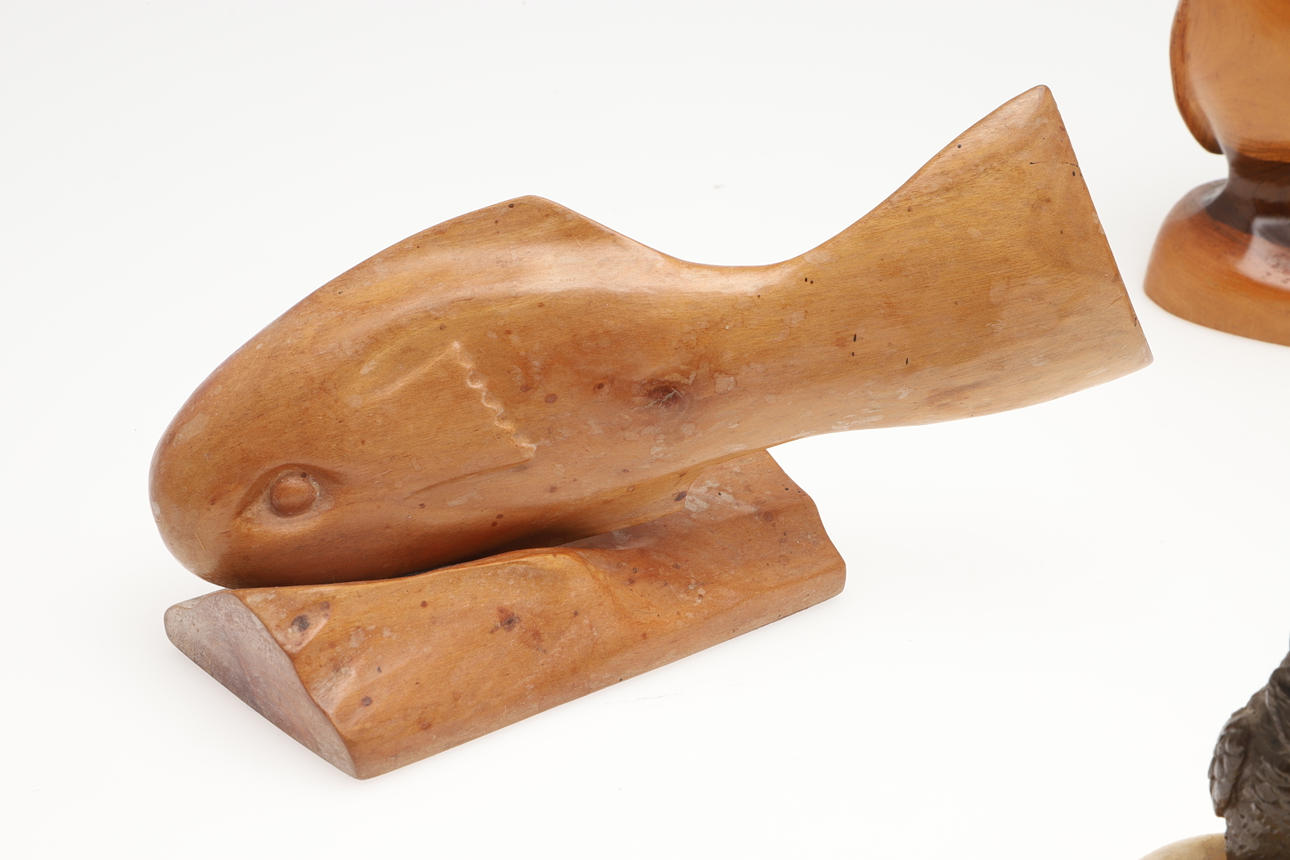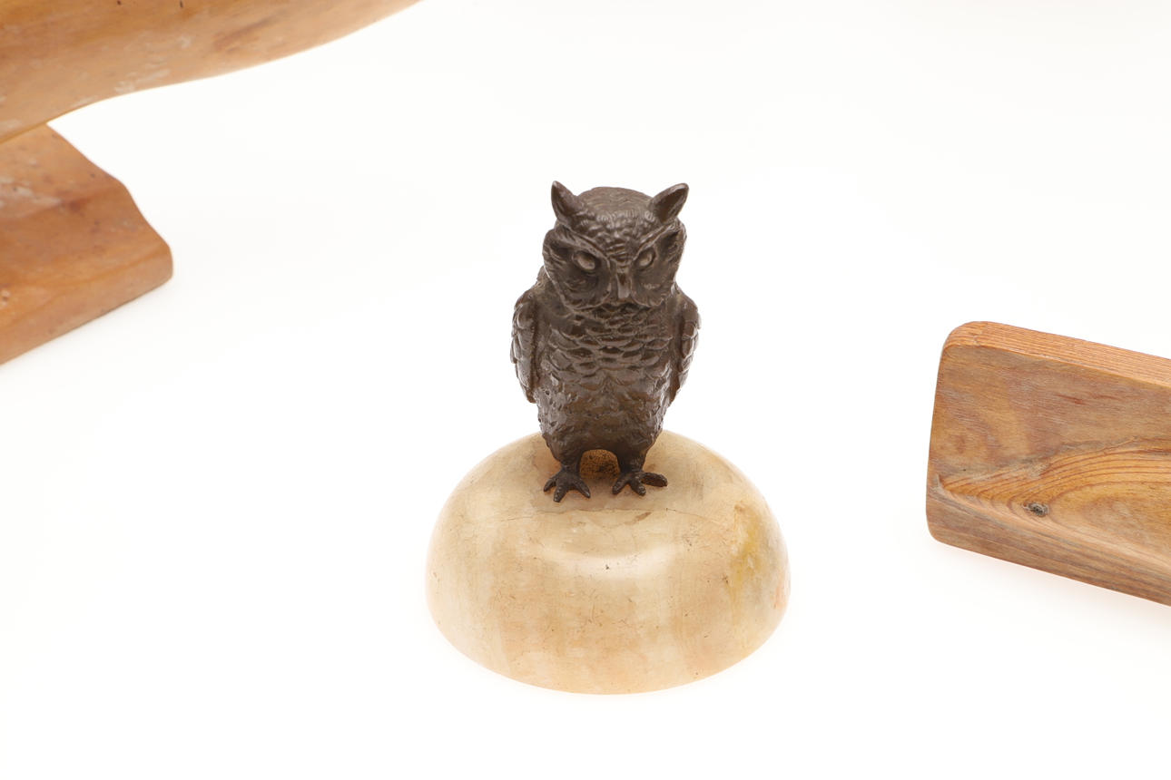 15,5 cm hoch, zusammen mit einer geschnitzten Eule aus Wurzelholz, zwei geschnitzten Fischen und einem Eulen-Tischgewicht aus bronziertem Metall auf einem Hartsteinsockel, 9 cm hoch.