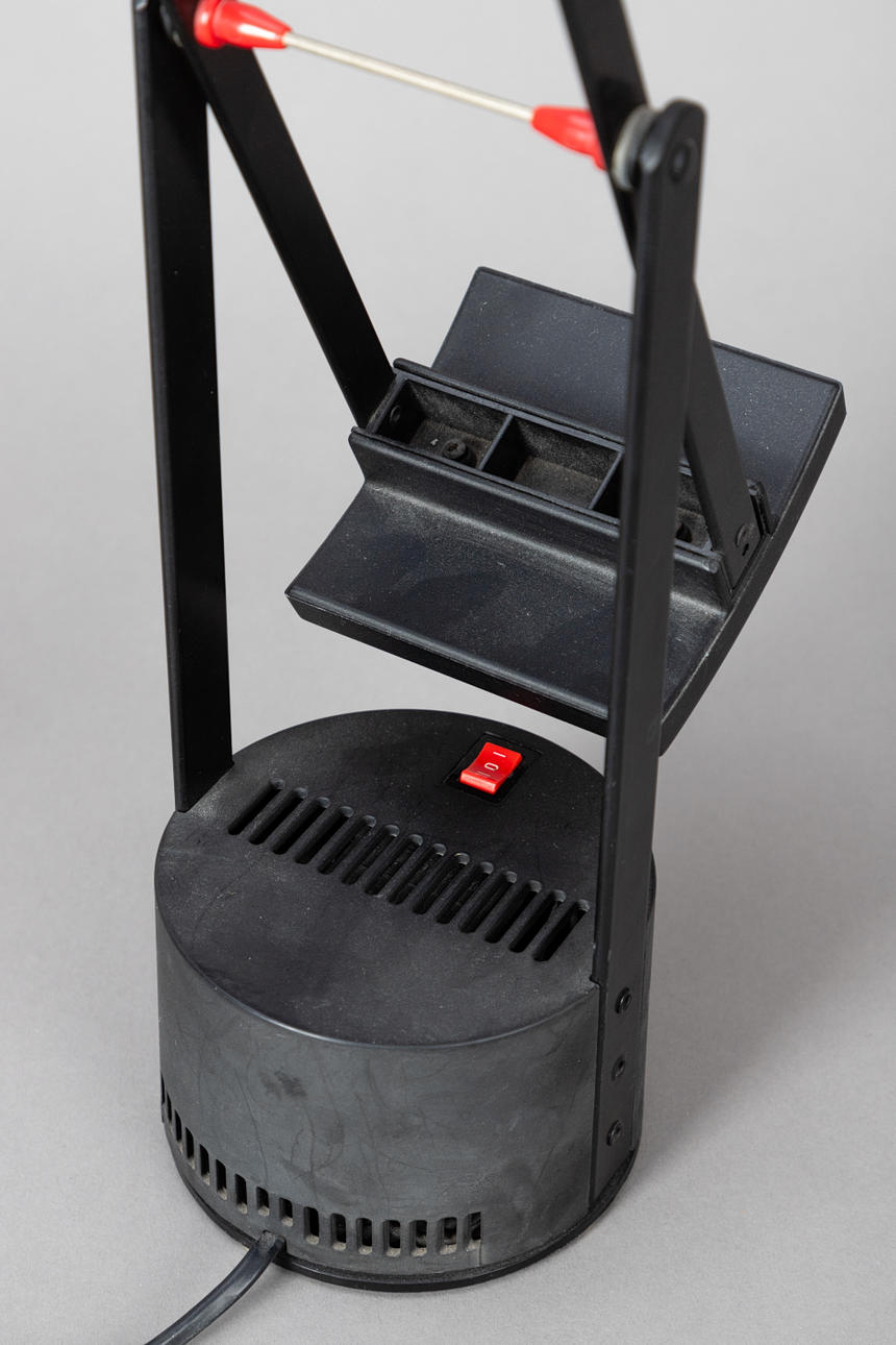 Lackiertes, schwarzes Aluminium und Kunststoff. Mehrfach verstellbar.