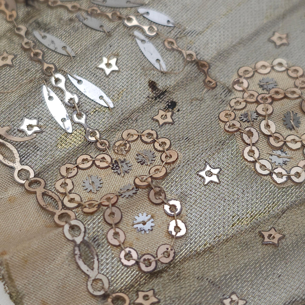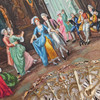 Länder auf bemalter Leinwand signiert J. Garrido, „El Minué“ ein weiteres aus Chiffon mit Pailletten, die Girlanden bilden.