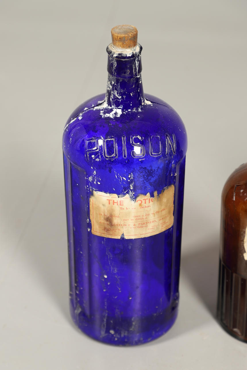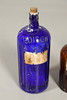 Drei braune Glasflaschen und eine blaue Glasflasche, die nach Größe sortiert sind, wobei die größte Flasche 36 cm hoch ist. Einige mit Originaletiketten und Stopfen/Korken. (4).