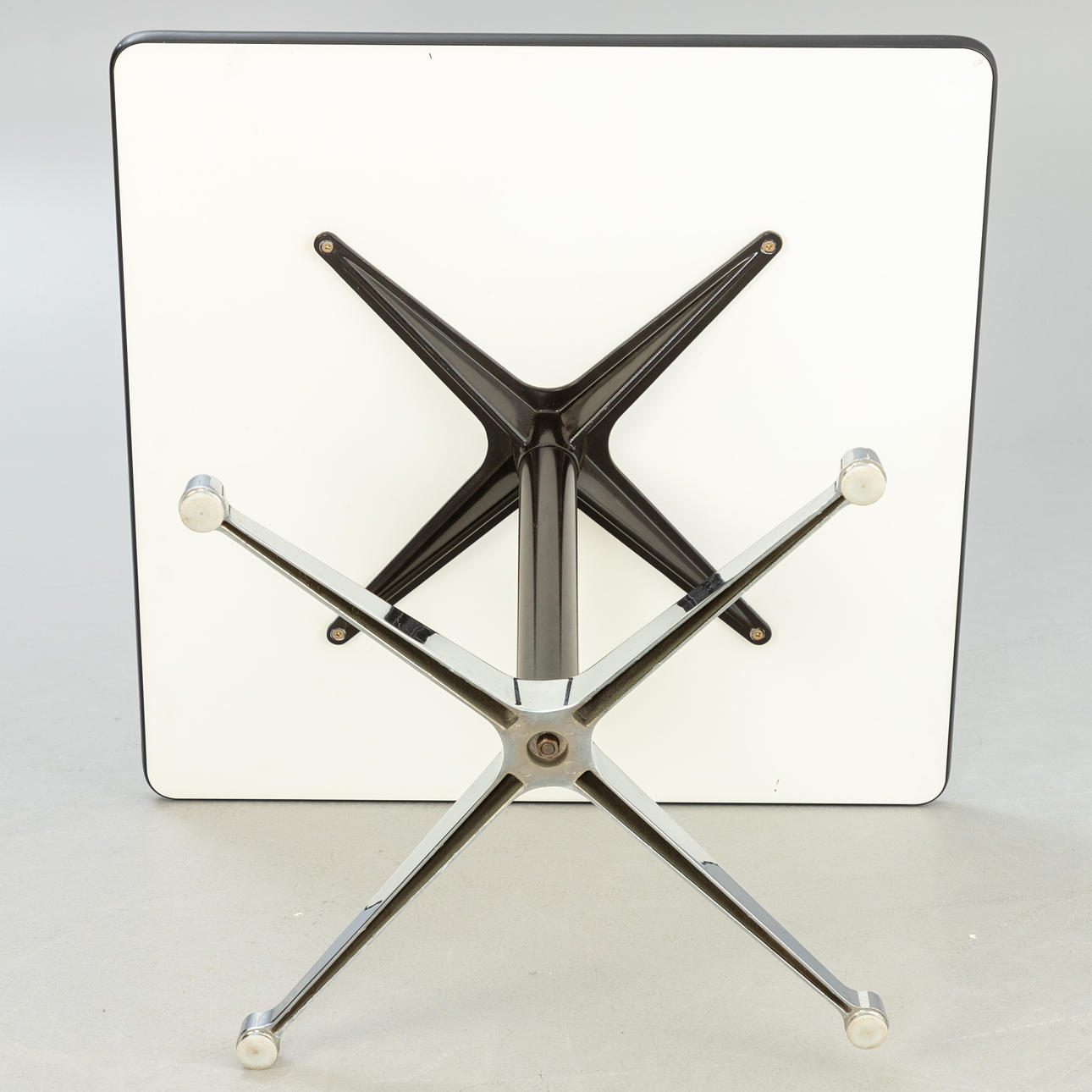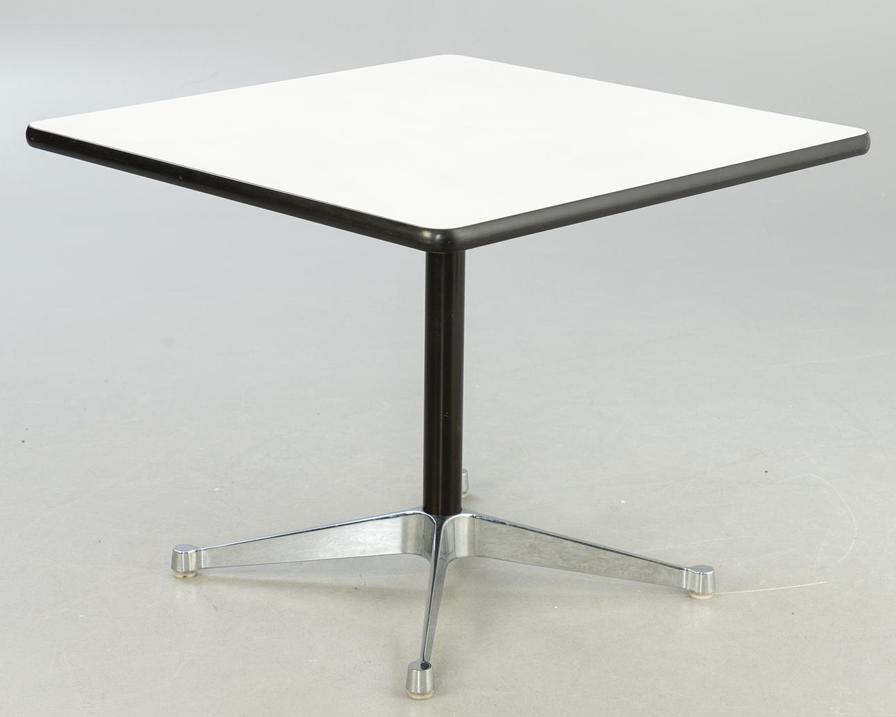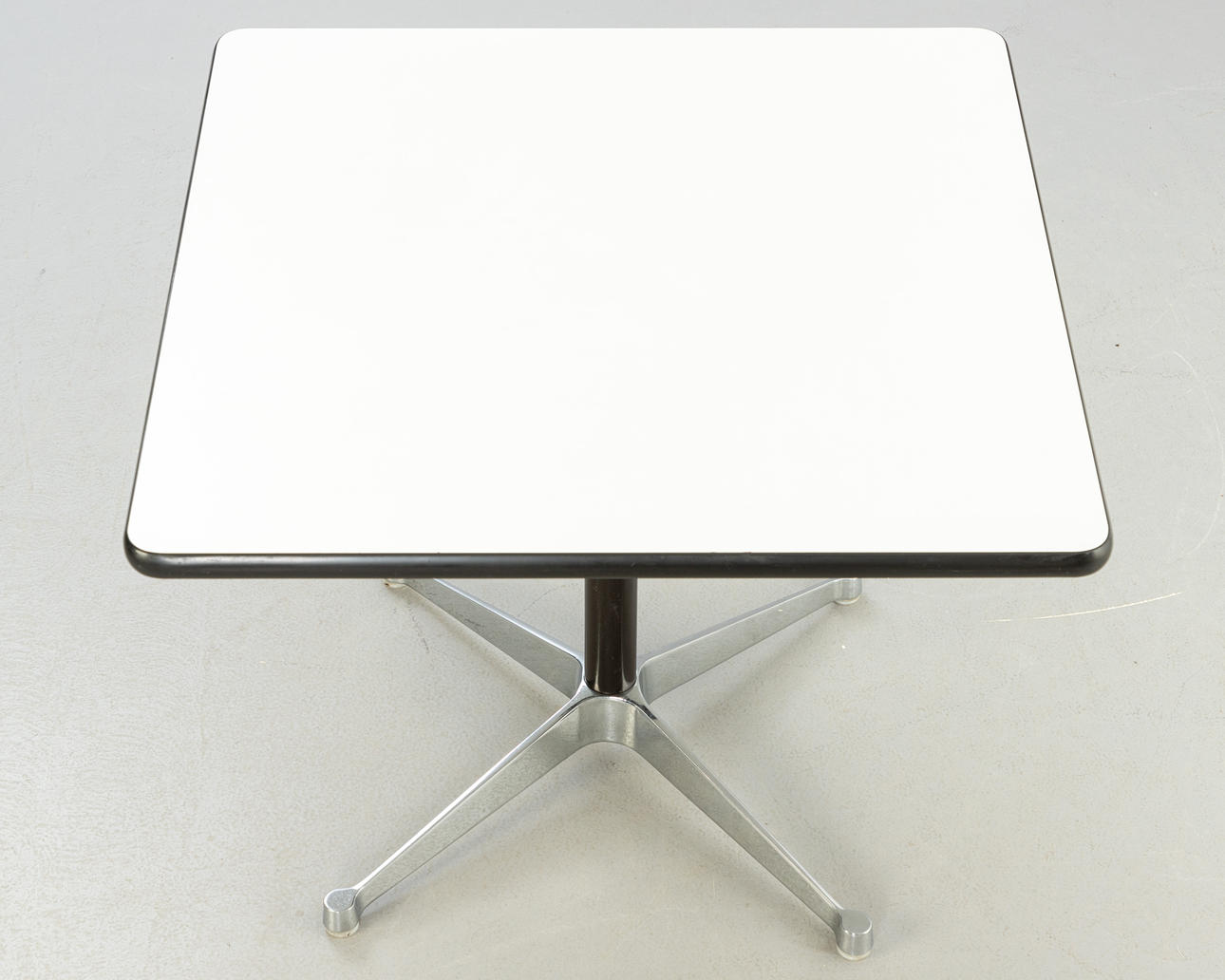 'Contract Table'. Entwurf: 1960er Jahre. Quadratische Tischplatte, weiß laminiert. Kunststoffkante. Vierfußausleger aus Aluminium-Druckguss. Kunststofffüße.