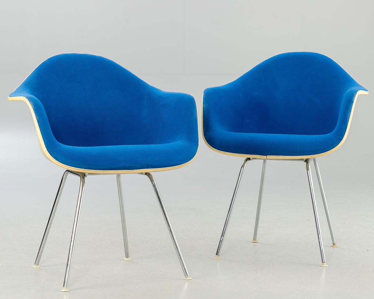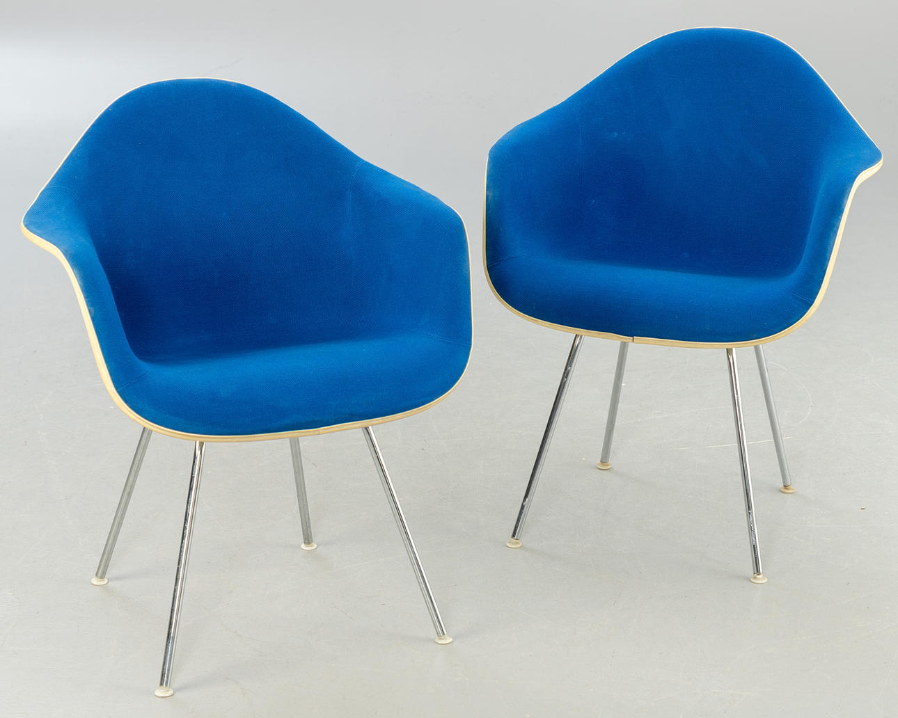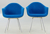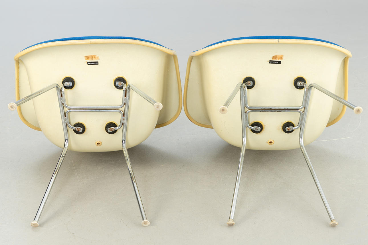 2 'DAX Chairs', Entwurf: 1950. Fiberglas Sitzschalen mit blauem Hopsak aufgepolstert und auf verchromten Vierbein-Stahlrohr Untergestellen.