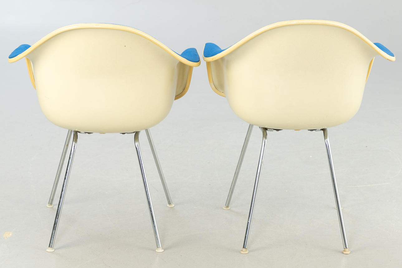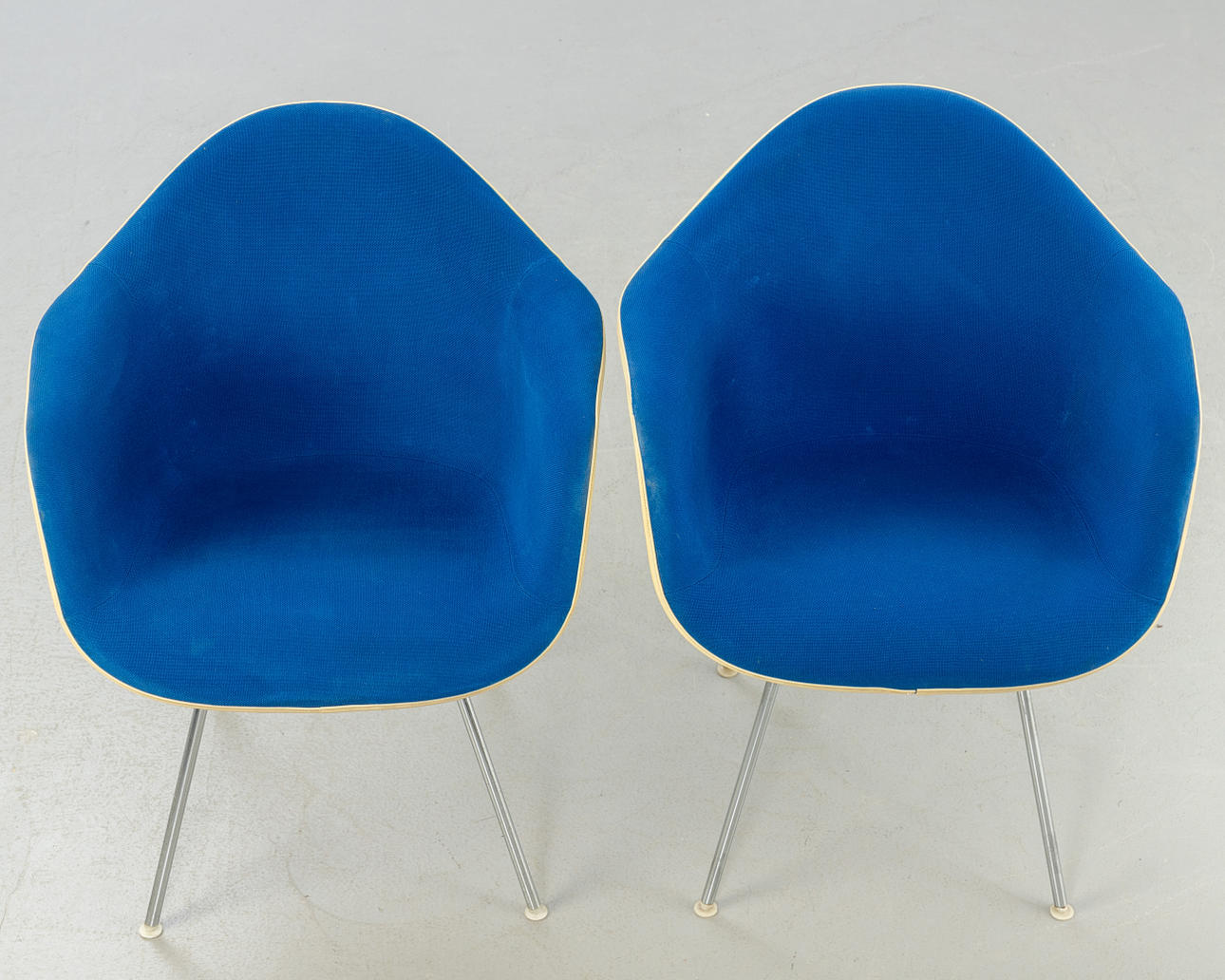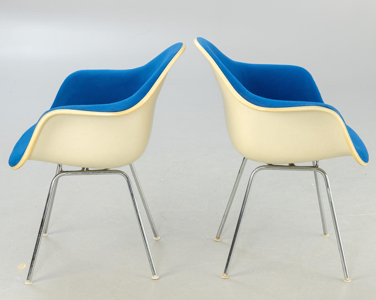 2 'DAX Chairs', Entwurf: 1950. Fiberglas Sitzschalen mit blauem Hopsak aufgepolstert und auf verchromten Vierbein-Stahlrohr Untergestellen.