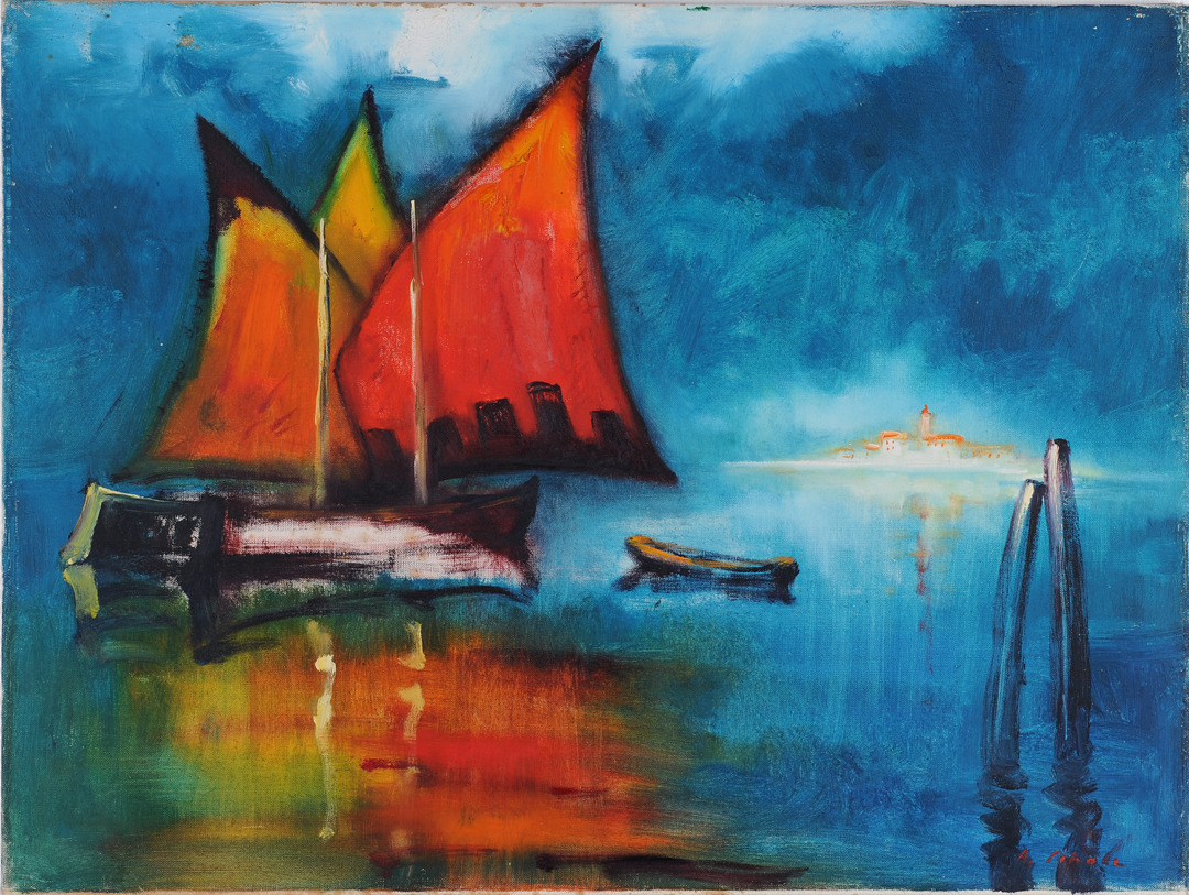 330680. ARNOLD SCHATZ. Segelboote im Mondschein, expressiv präsentiert.