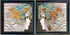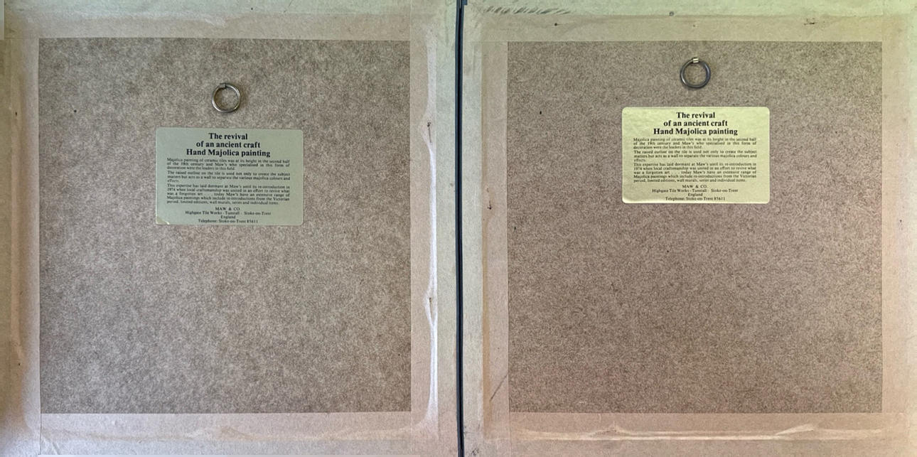 Ein Paar gerahmte handbemalte Keramikfliesen, Rahmengröße 24,5 x 24,5 cm.