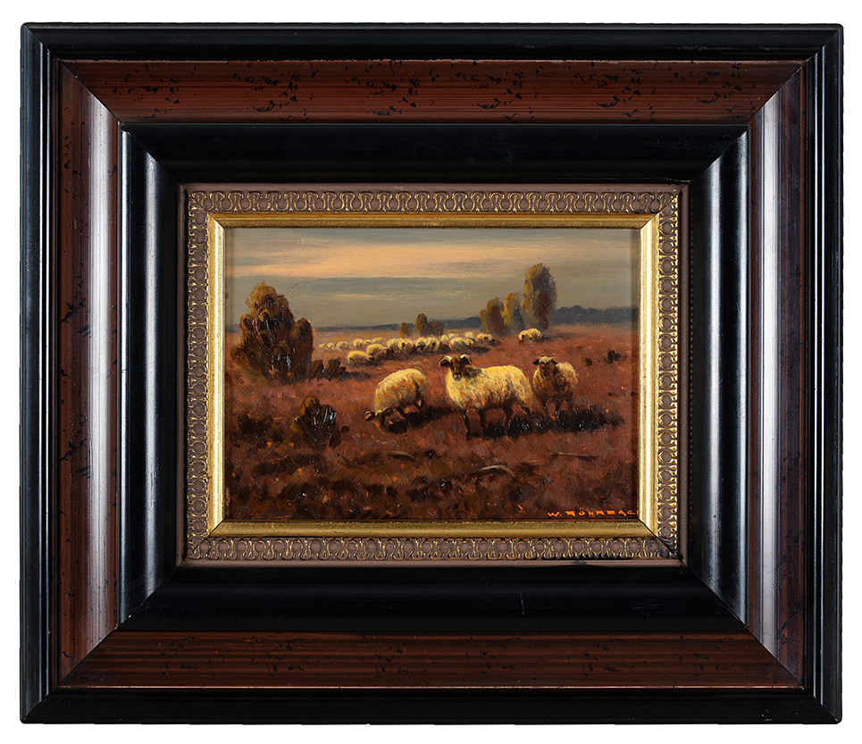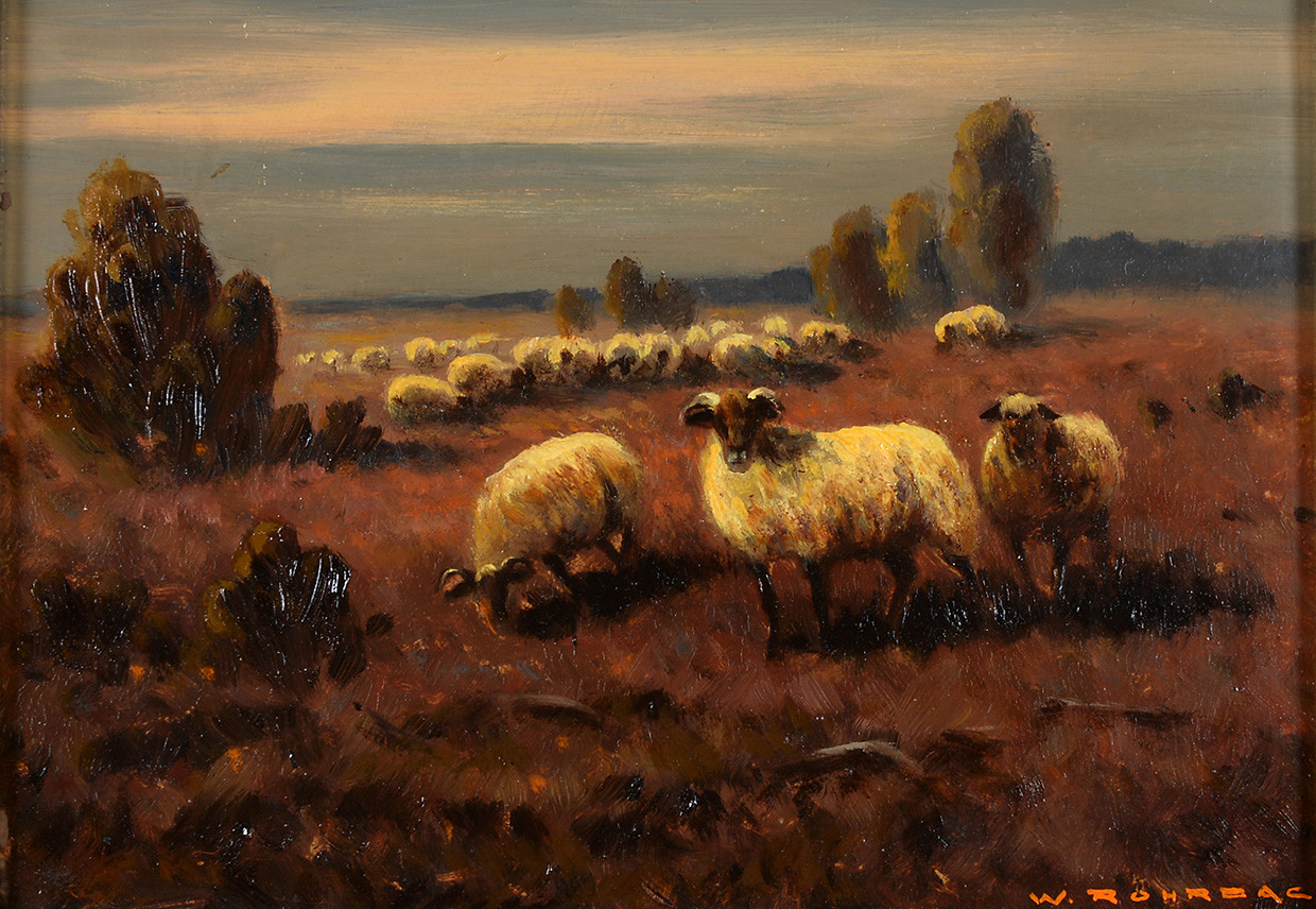 3317273. WALTER ROHRBACH. " Heidelandschaft mit Schafen ". Öl auf Holz.