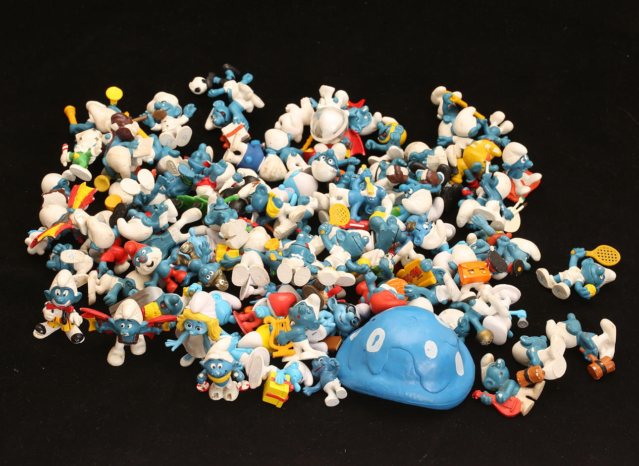 Ein Menge SCHMURFER. SCHLUMPFHÄUSER. Plastik, 20. Jahrhundert.