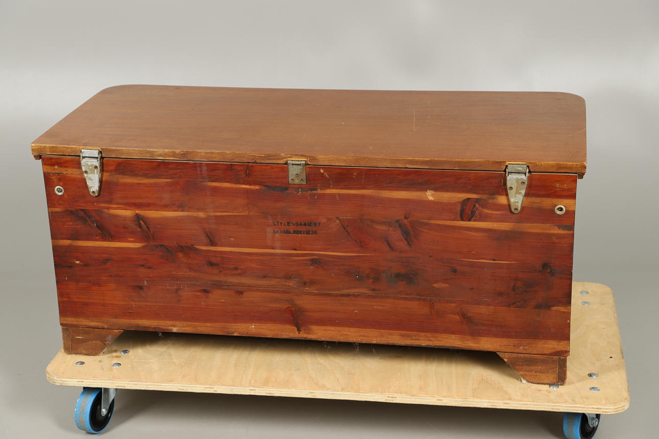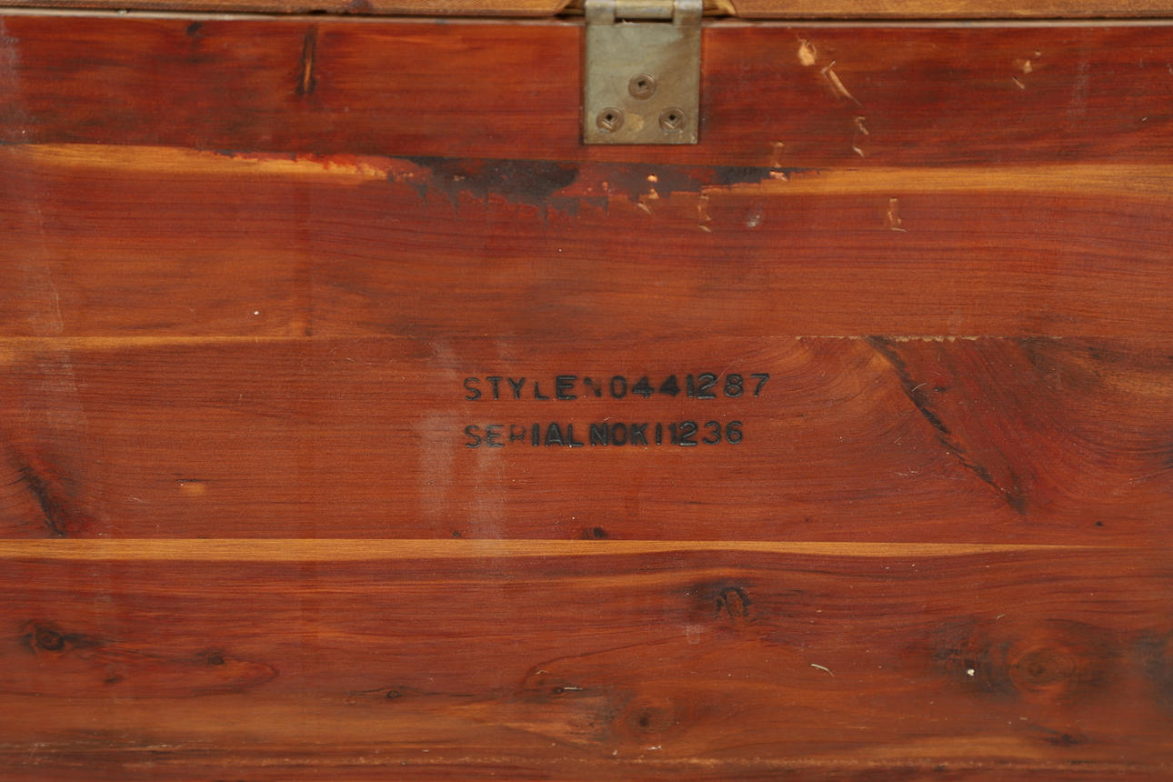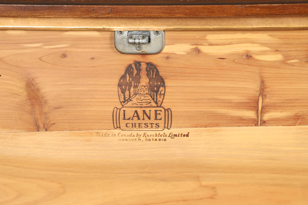 Hergestellt von Lane Chests aus Hanover, Ontario, in rechteckiger Form mit abgerundeten, geriffelten Ecken, auf der Innenseite mit Herstellermarken und Originaletikett gestempelt. 110 cm x 48 cm, 48,5 cm hoch.