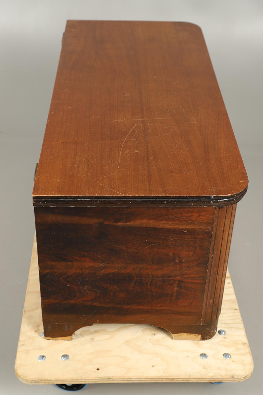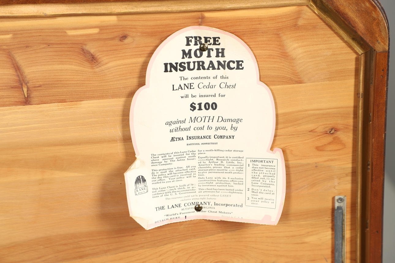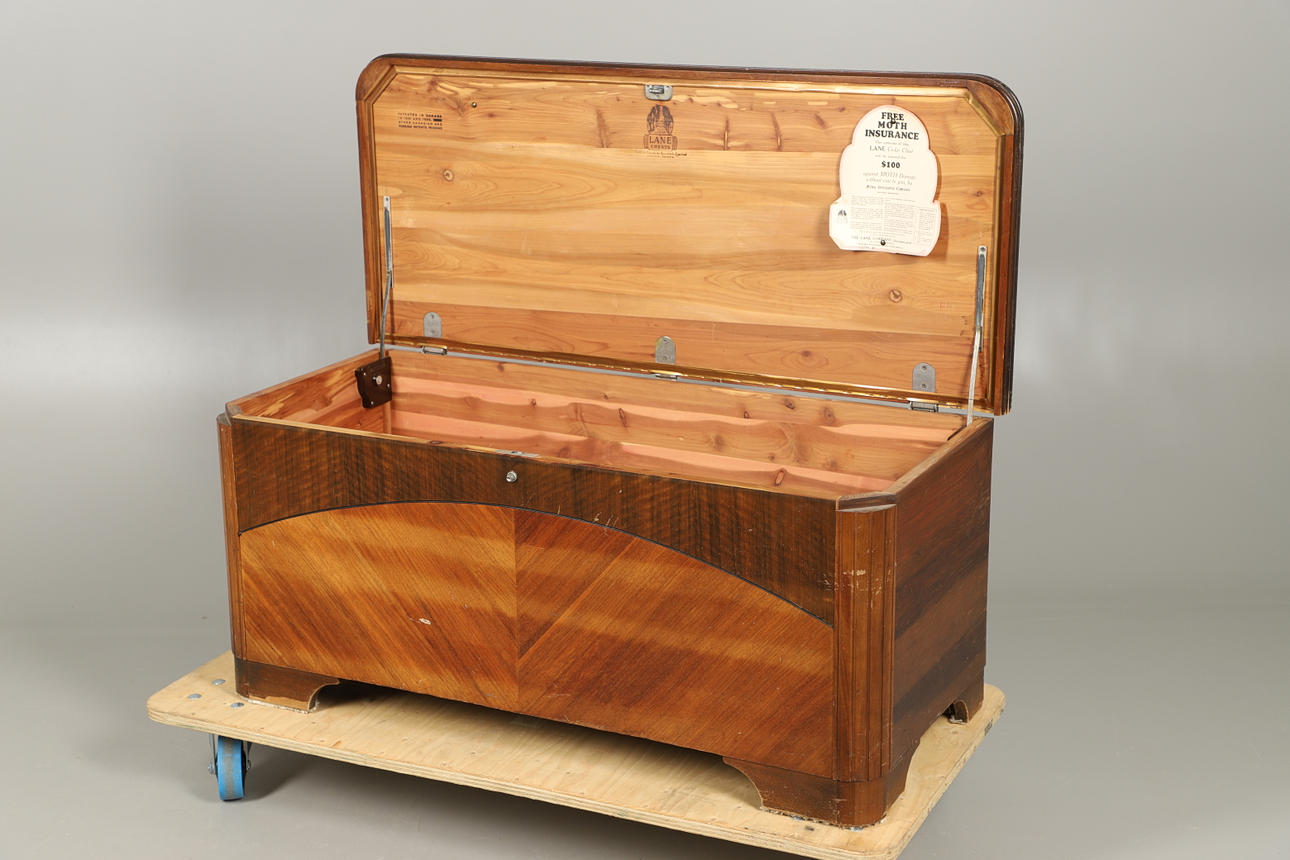 Hergestellt von Lane Chests aus Hanover, Ontario, in rechteckiger Form mit abgerundeten, geriffelten Ecken, auf der Innenseite mit Herstellermarken und Originaletikett gestempelt. 110 cm x 48 cm, 48,5 cm hoch.