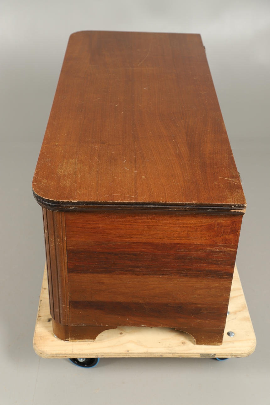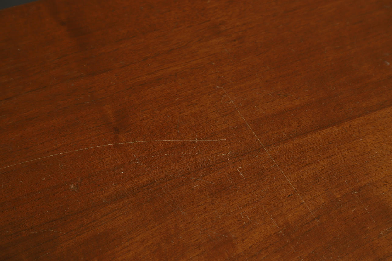 Die Oberseite, die Vorderseite und die Seiten haben verschiedene Spuren und Kratzer, die Vorderkante weist verschiedene Gebrauchsstellen auf, Furnier an den Beinen und einige Gebrauchsspuren an den Beinen.