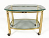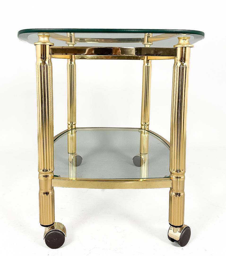 Tisch mit Glasplatte und Glasablagen. Vier Räder mit Messingbeschlägen. Maße der Tischplatte: 69,5 x 53 cm, Ablage 41 x 58 cm. Höhe ca. 53 cm.